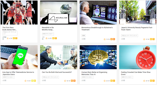 レベルは初級から上級まで幅広く、カテゴリーはビジネス/経済、科学/テクノロジー、生活/エンターテインメント、健康、スポーツ、アート、旅行、ワールド、アジアの計9つをご用意しており、豊富な種類の中から自身の関心に合った記事で英会話レッスンを受講することが可能です。