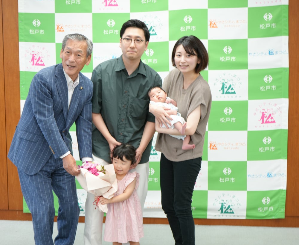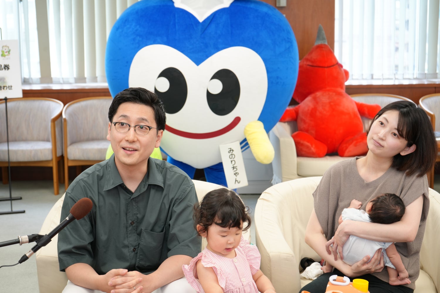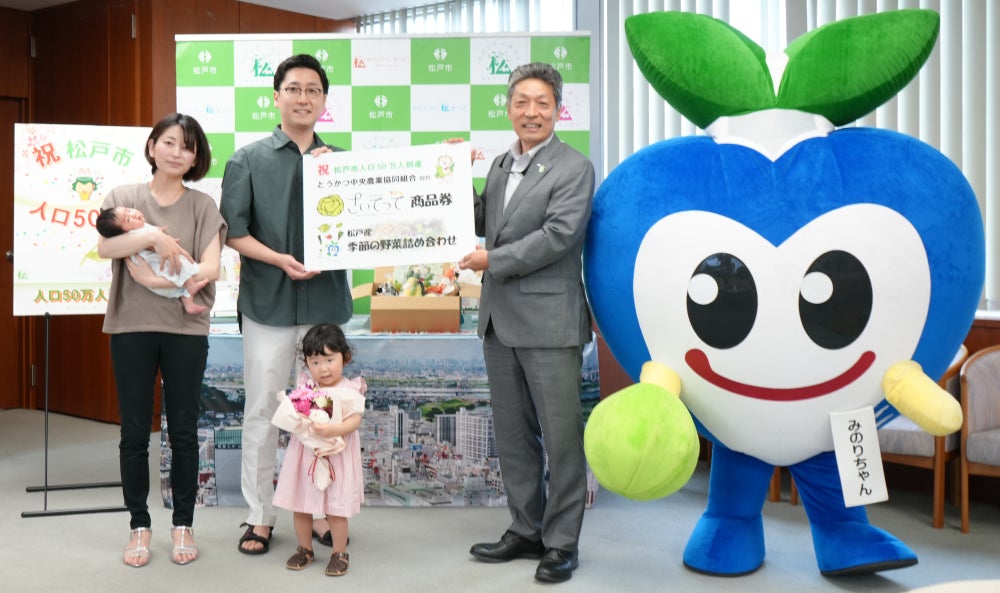 50万人目の市民となったのは、6月1日に生まれたばかりの千葉遥賀(はるか)さん。改めて人口50万人到達をお祝いするため、7月10日(水)に千葉さん一家を市役所にお招きし、セレモニーを開催しました。