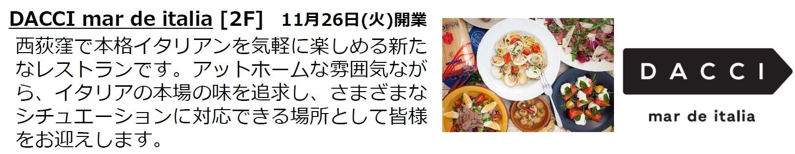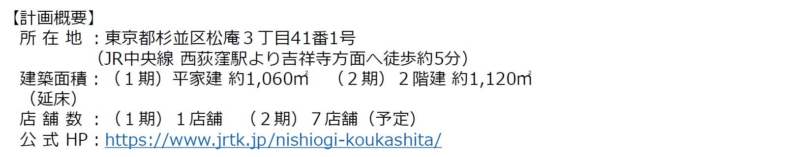 株式会社ジェイアール東日本都市開発は、JR中央線 西荻窪駅~吉祥寺駅間で進行中の西荻窪高架下開発について、2024年11月26日より2期区画をオープンいたします。高架下の立地を活かし、既存の施設に加えて新たに食の楽しみを感じられる施設をご用意し、地域の方々にとって“まちの一部”と感じていただける場所づくりを引き続き進めてまいります。