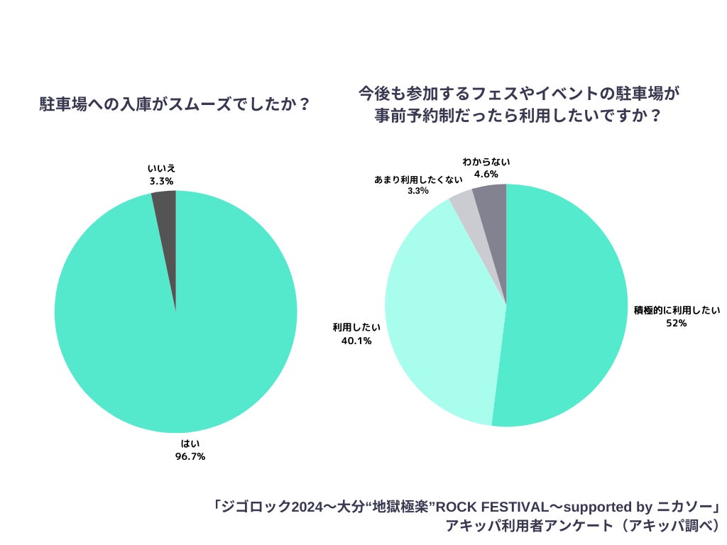アキッパは昨年も公式駐車場の運営サポートをしており(※)、イベント終了後にアキッパを利用したユーザーに実施したアンケート調査では、96.7%が「駐車場への入庫がスムーズだった」と回答しているほか、92.1%が「今後も参加するフェスやイベントの駐車場が事前予約制だったら利用したい」と回答しています。