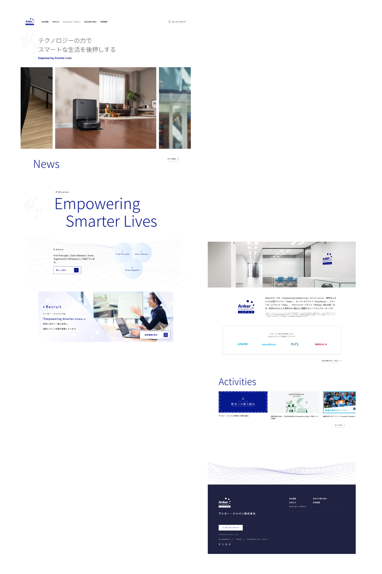 これまで公式サイトに包含されていた企業関連情報を、新たに「Anker Japan コーポレートサイト」として分割し、採用情報やコーポレートとしての取り組み、組織カルチャーをより深くお伝えします。会社内部についての情報やコンテンツを充実させ、協業をご検討いただいている企業様や、アンカー・ジャパンでの仕事に興味があり入社を検討している方を含めた、外部の方にわかりやすく紹介するためのサイトです。