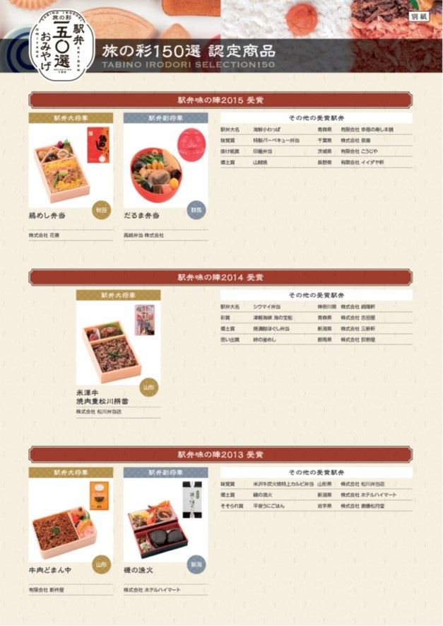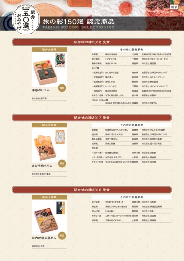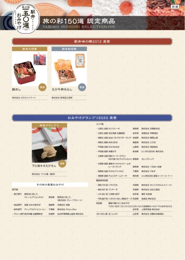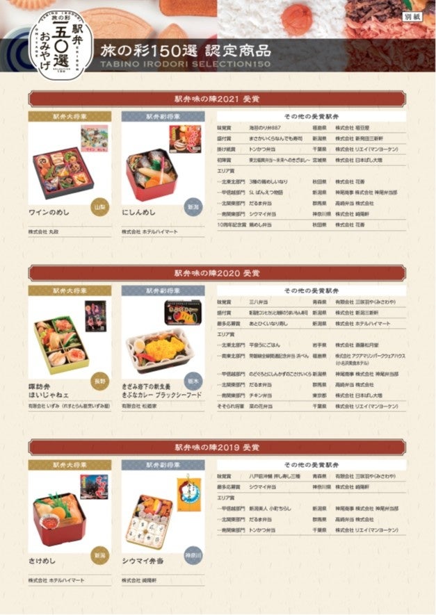 ○ 認定商品 JR東日本管内1都15県および北海道における過去の「JR東日本駅弁味の陣」「みんなが贈りたい。おみやげグランプリ」歴代受賞商品を中心に駅弁やおみやげなど「旅の彩 150選」として認定します。