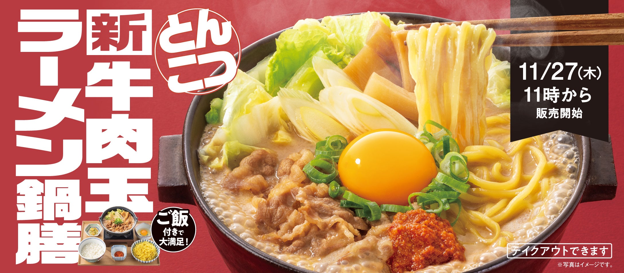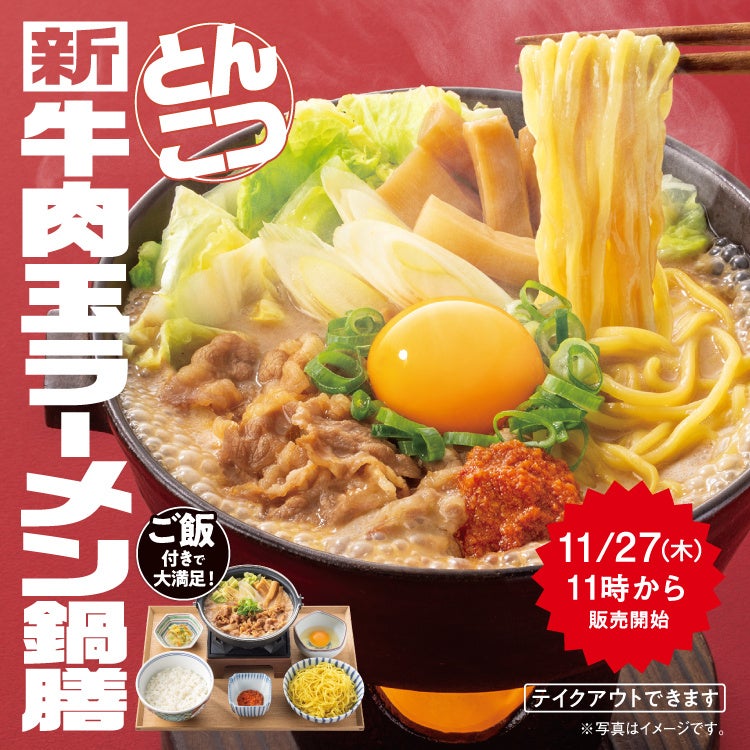株式会社吉野家(本社:東京都中央区、代表取締役社長:成瀨哲也、以下吉野家)は、2025年11月27日(木)11時より、全国の吉野家店舗(一部店舗を除く)にて、冬の期間限定新商品「牛肉玉ラーメン鍋膳(とんこつ)」、本体価格898円(店内税込987円、テイクアウト税込969円)の販売を開始いたします。ご飯の増量・おかわりは無料です。テイクアウト※も可能です。