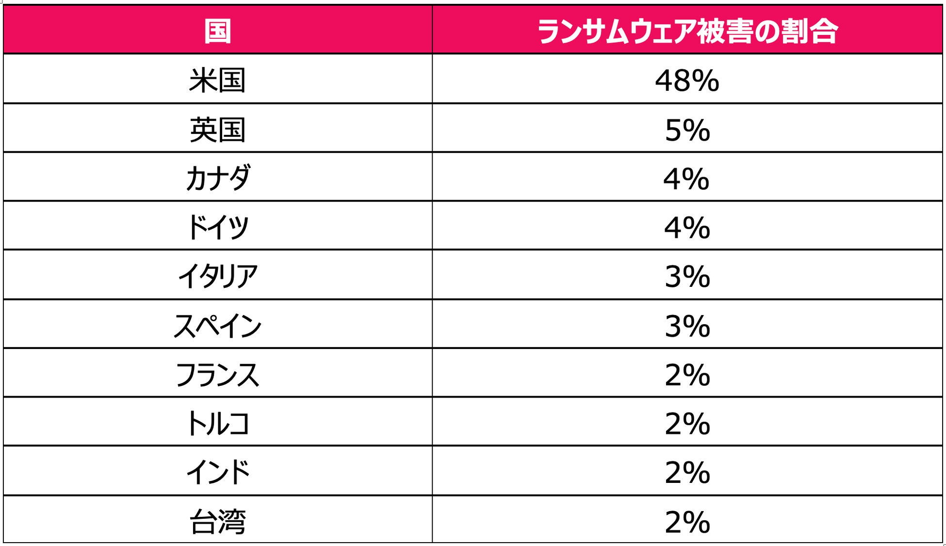 国別では、引き続き米国(48%)が最も標的とされました。その他、大きな被害を受けた国の上位には、英国(5%)、カナダ(4%)、ドイツ(4%)、イタリア(3%)、スペイン(3%)が含まれています。