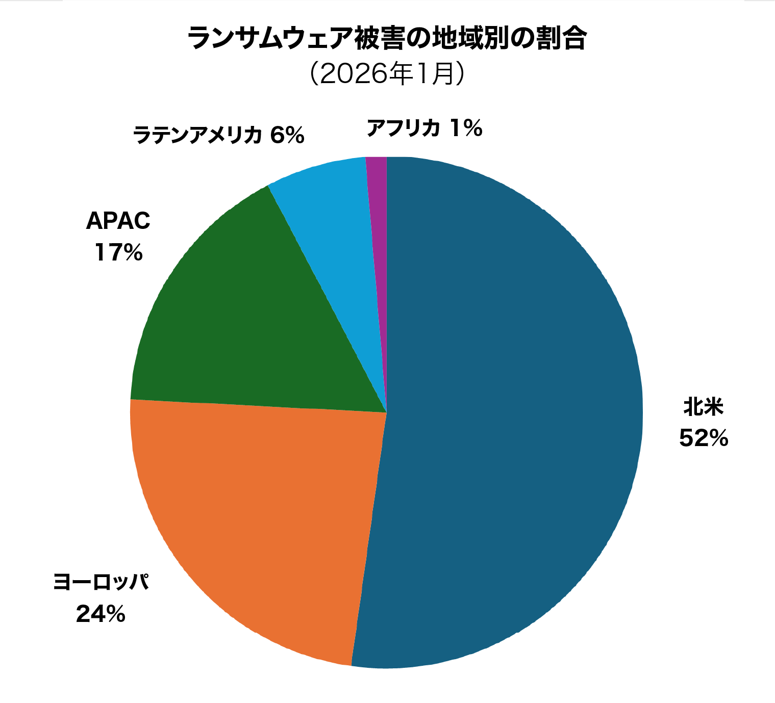 北米はランサムウェア被害全体の52%を占め、次いでヨーロッパ(24%)が続きました。これは、広範なデジタルインフラを有する高価値市場に対して、攻撃者が引き続き注力していることを示しています。