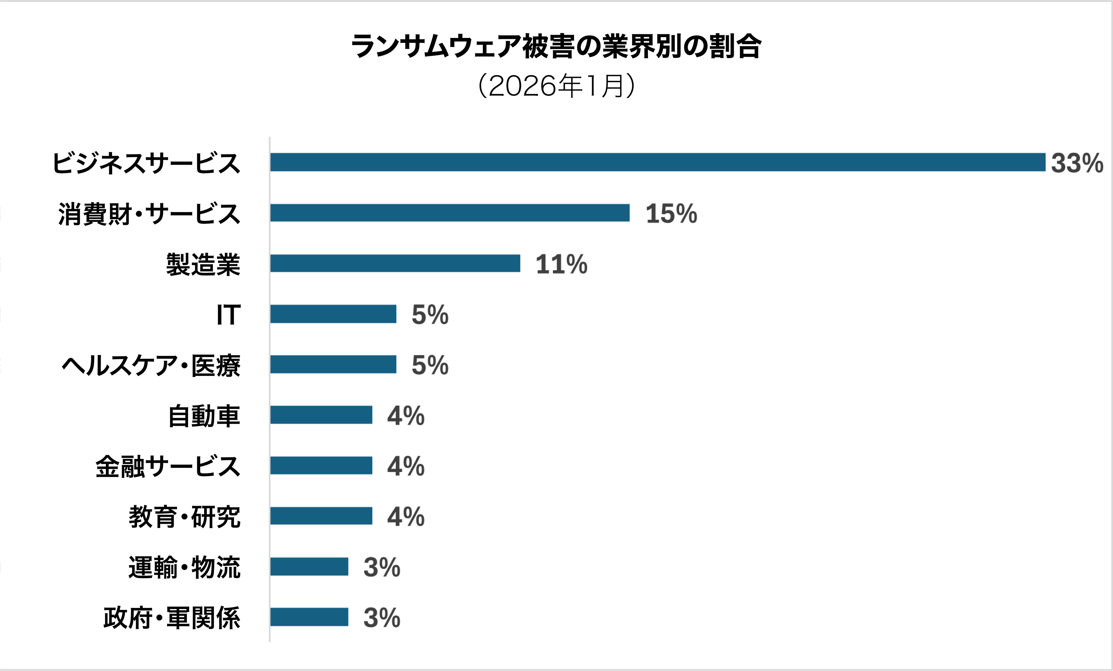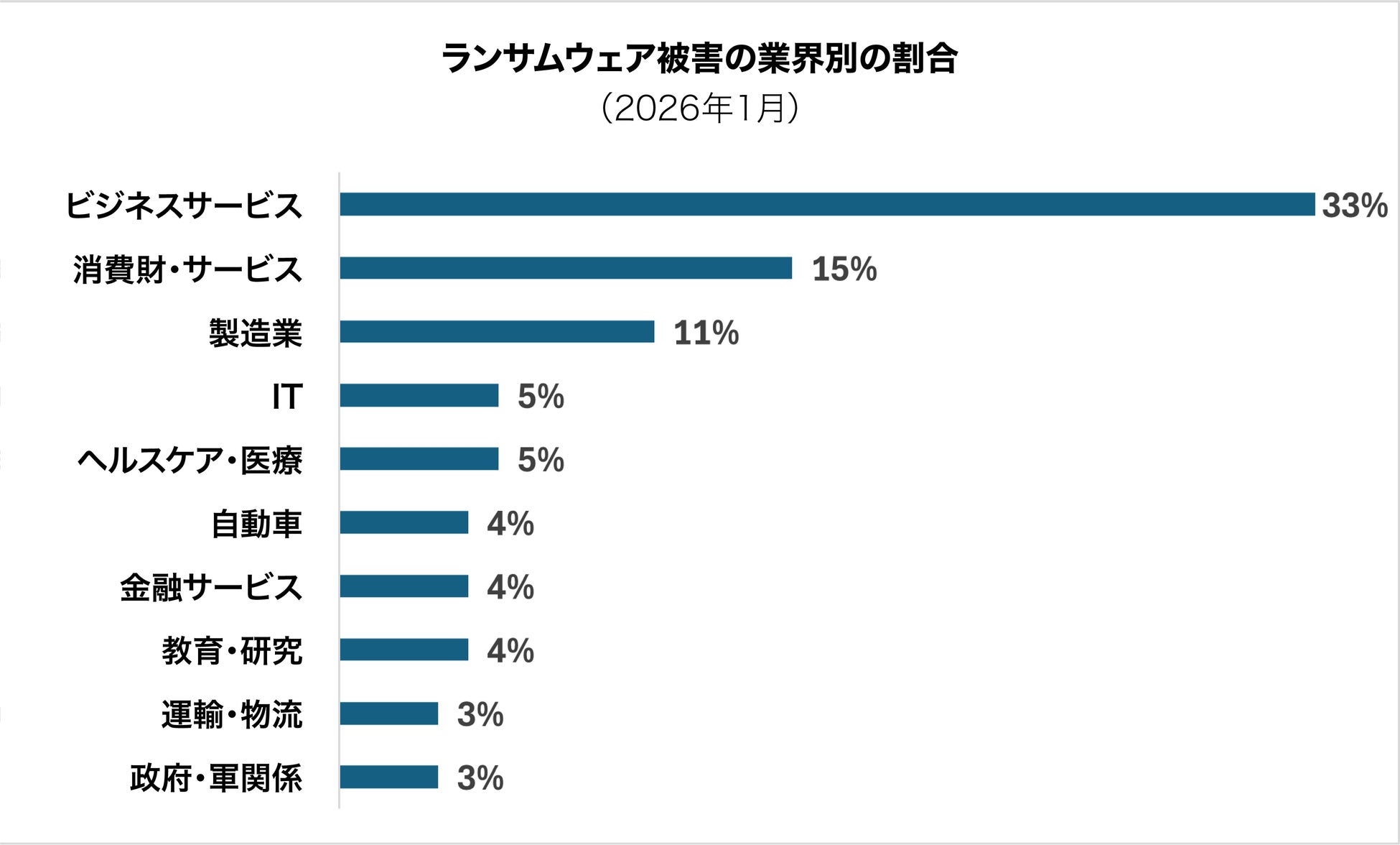業界別では、業務の継続性への依存度が高い業界が主要な標的となっています。ビジネスサービスがランサムウェア被害全体の33%を占め、消費財・サービス(15%)、製造業(11%)が続きました。これは、ダウンタイムが直接的に財務・評判上の損害につながる分野を攻撃者が重視していることを示しています。