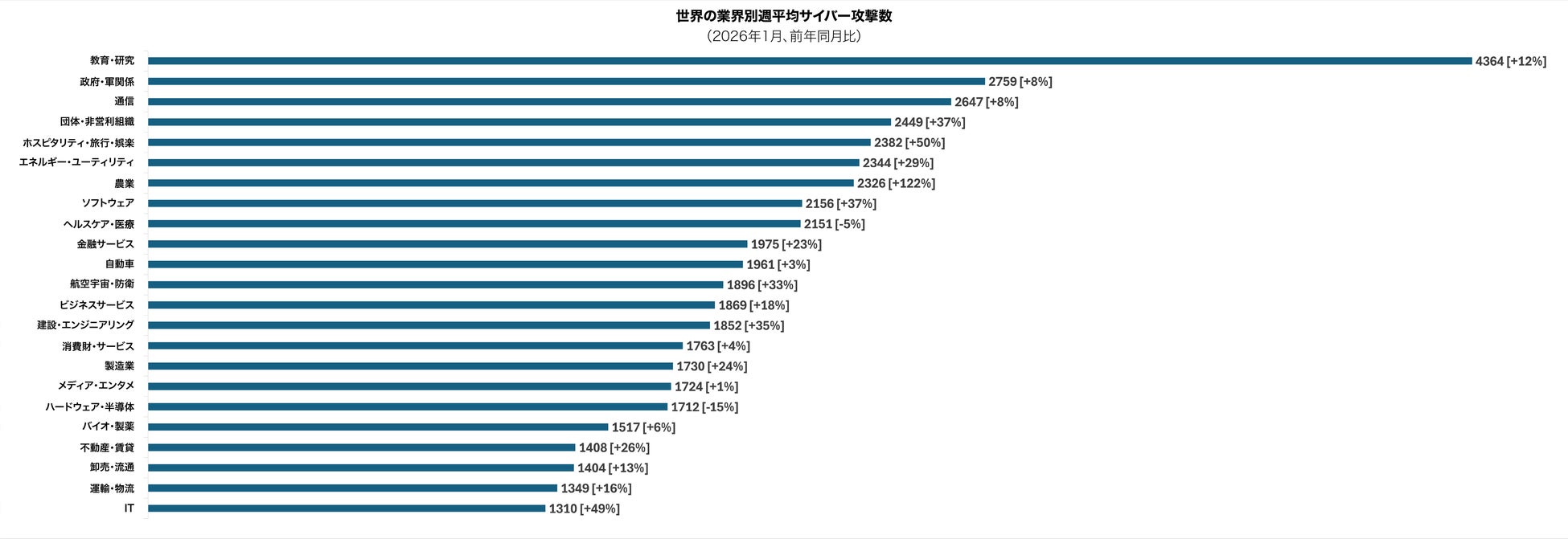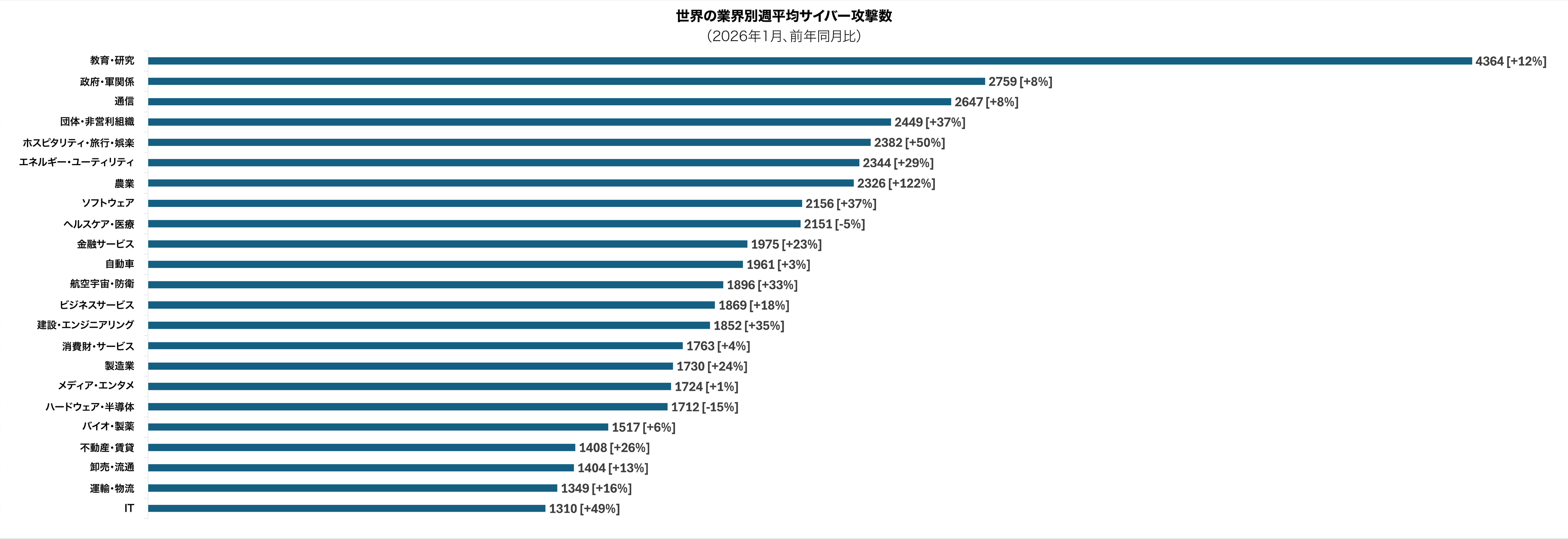 2026年1月も引き続き「教育・研究」分野が最も標的とされ、1組織当たり週平均4,364件の攻撃を受けて前年比12%増となりました。エクスポージャーの拡大、大規模なユーザー基盤、老朽化したインフラへの依存といった要因により、同分野は依然として脅威アクターにとって魅力的な標的となっています。