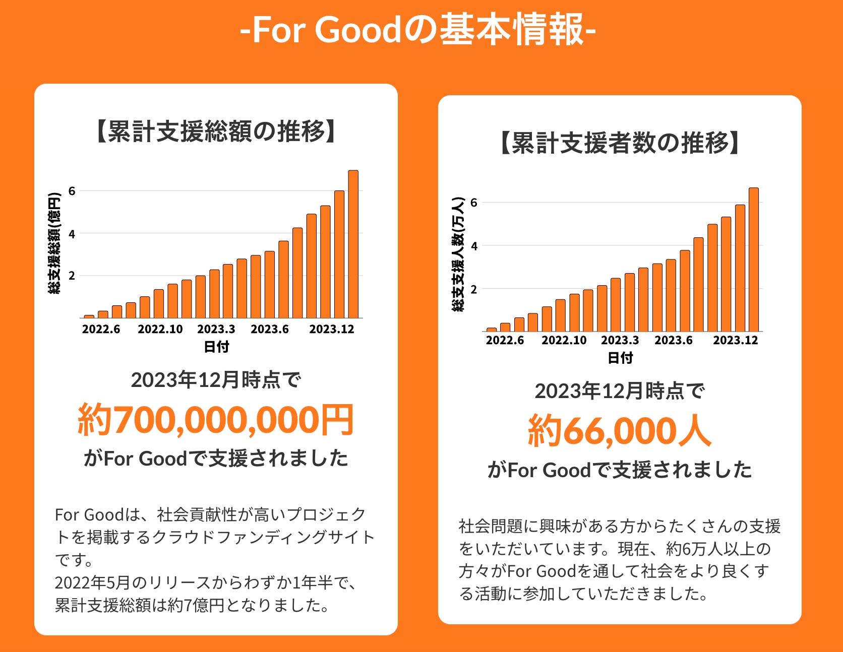 今後もFor Goodは、「社会課題解決の民主化」の実現に向け、クラウドファンディングを利用して社会をより良くする活動を促進することを目指す実行者と、それを支える支援者をお繋ぎするための施策を進めてまいります。