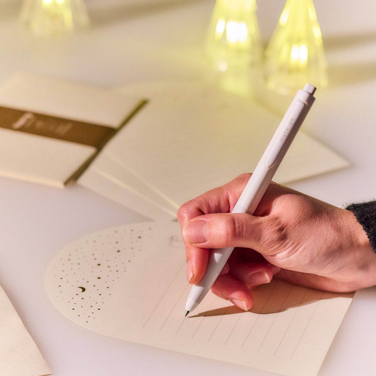 従来品からノック音を33%カットした静音設計で、雪の降る日の静けさを乱さないような、優しい使い心地です。ペン先が出ているときはクリップ部分がフラットになり、ペン先を出したまま胸ポケットに挿してしまう心配がありません。実際に使うほど愛着の湧く一本です。