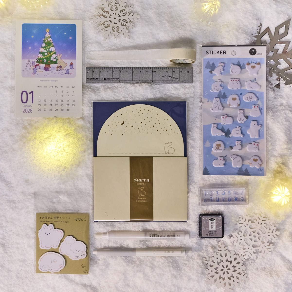 雪の降る冬の日をイメージした白を基調とする文房具全9点を厳選。実用性の高いアイテムや白い動物をモチーフにしたアイテムを組み合わせ、優しく穏やかな雪の日を感じられるボックスに仕上げました。