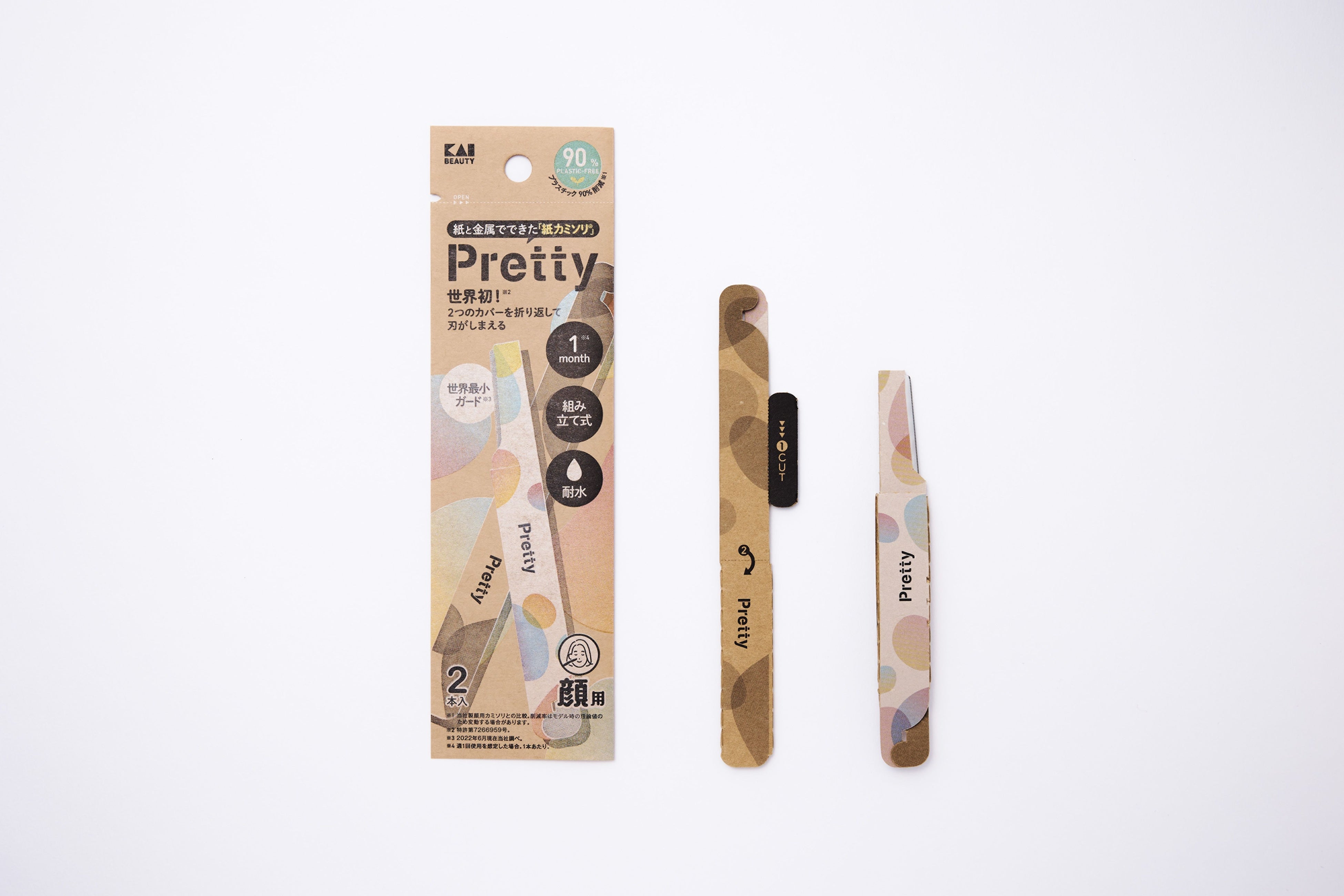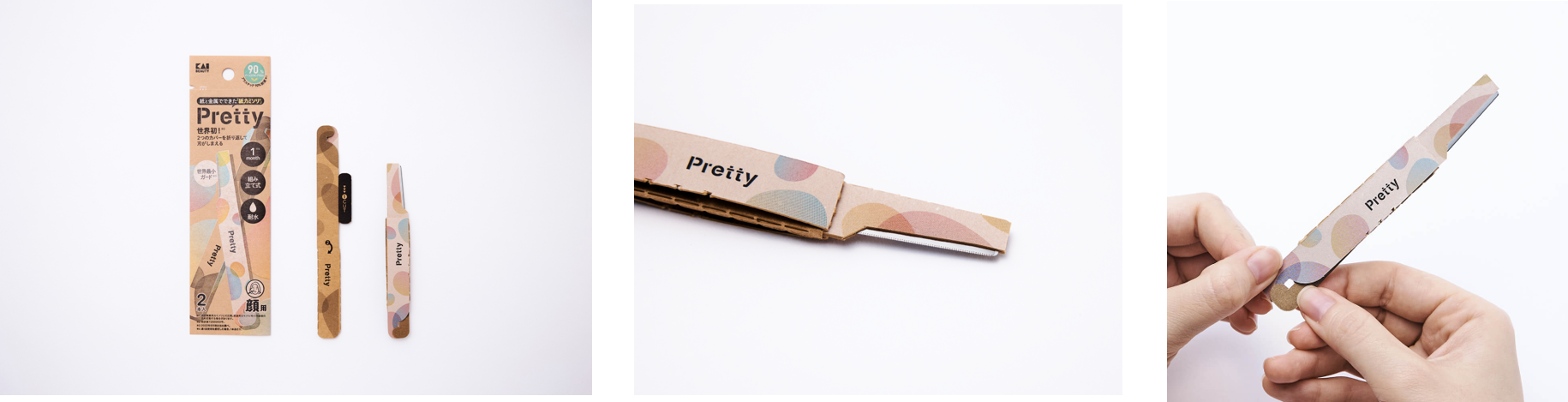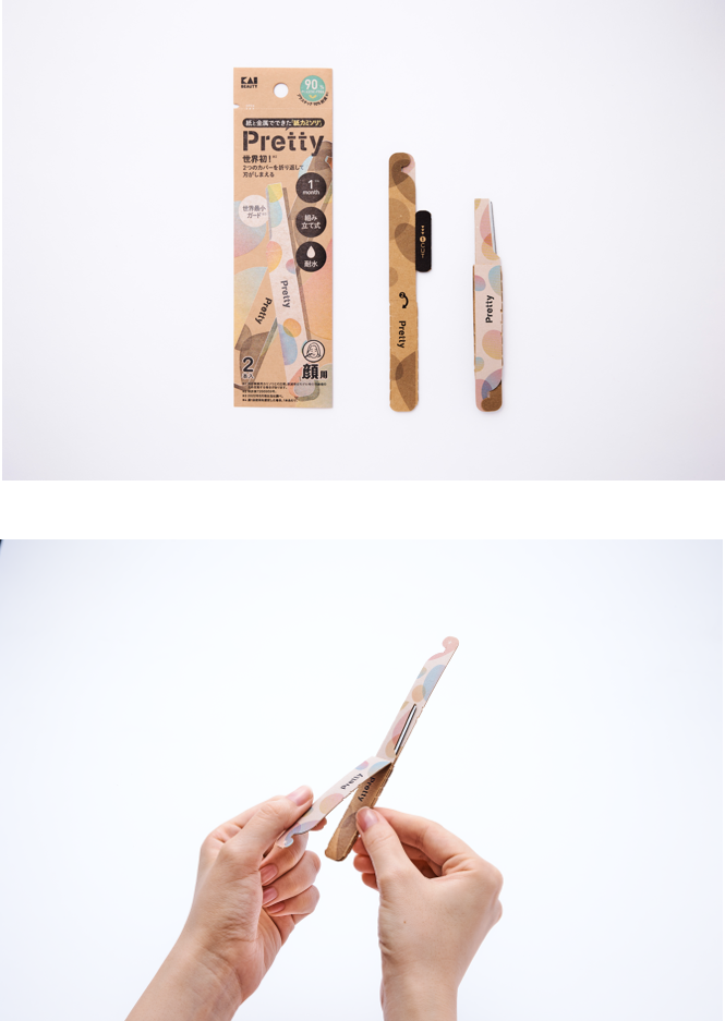 プラスチック削減を極限まで目指した、紙製ホルダーと金属製刃で構成されたフェイス用のL型カミソリ。3ステップの簡単な展開方式とし、持ち運びのし易さにも配慮。展開した本体を閉じる事で刃を保護でき、キャップレスな構成を実現。