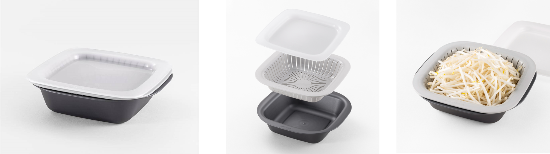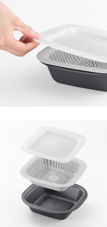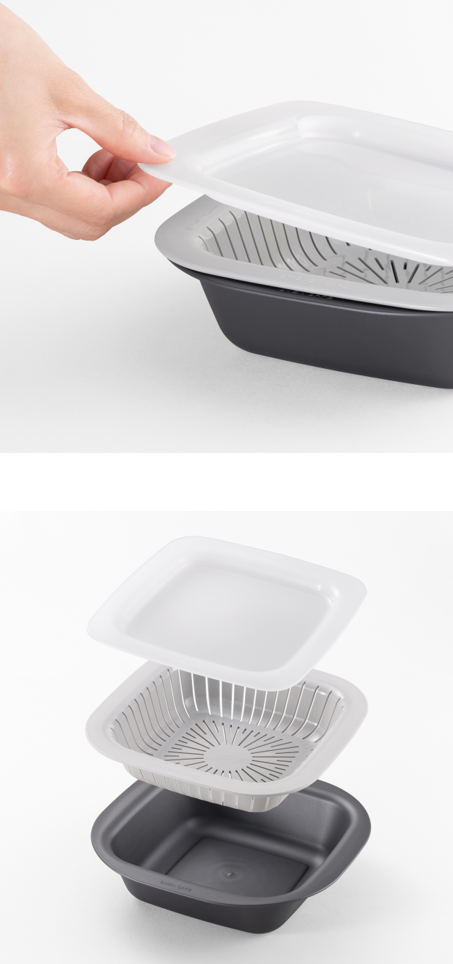 現代のライフスタイルに合わせ、調理作業の負担を減らして多様に活用できる調理ツール。 浅型(トレー)・コランダー・深型(トレー)の組み合わせで電子レンジやオーブン(*深型のみ)調理など、様々な調理作業を可能にする調理容器。