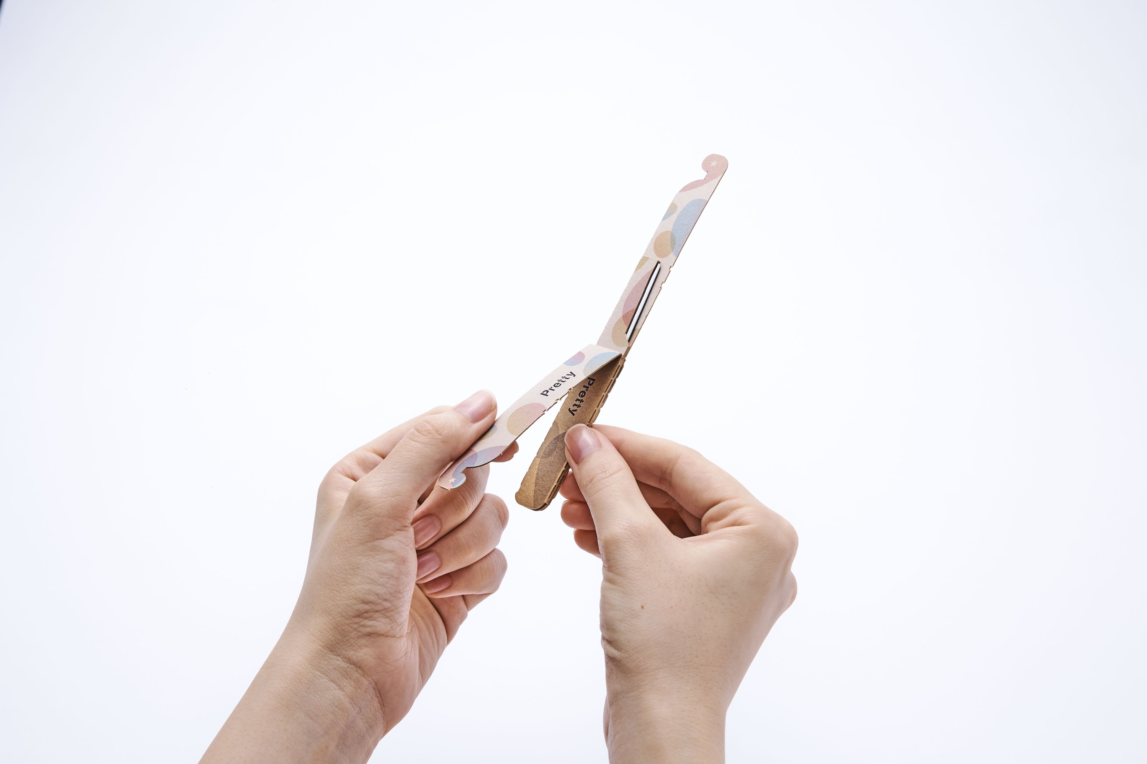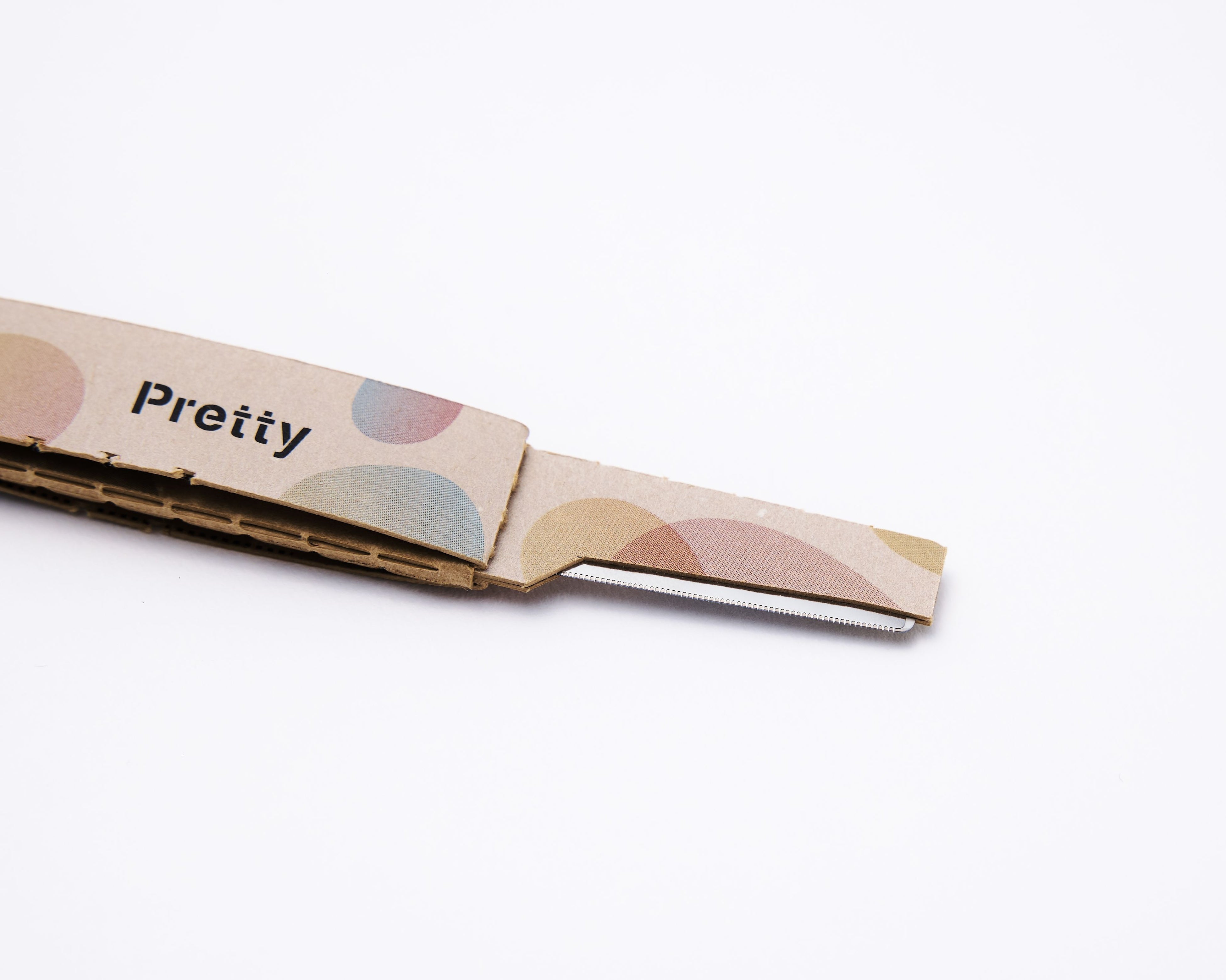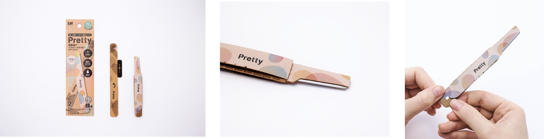 既に生産しているT型の紙カミソリ®と併せた環境配慮型刃物製品を生み出したいという想いから考案。本製品実現のため、紙を五層重ねることで使用時の剛性を出した。重ねた紙のうち二層を開閉式とすることで未使用時の刃の保護が可能となり、さらに二層の紙をフック固定式にすることでキャップレスな構成を実現し部品点数を削減。本製品を初めて使用する際に取り外す「タブ」形状追加により、製品のバージン性と安全性を保つと同時に、輸送時などにパッケージ内で刃が露出しない様配慮している。