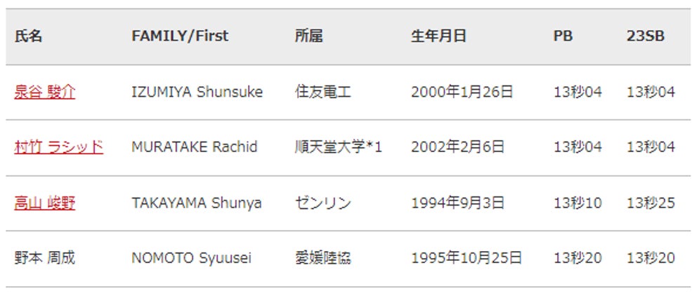 男子110mハードルには、ブダペスト2023世界選手権(https://www.jaaf.or.jp/wch/budapest2023/)で日本人初のファイナリストとなり5位入賞を果たした泉谷駿介(住友電工)、杭州2022アジア競技大会(https://www.jaaf.or.jp/competition/detail/1773/)金メダリストの高山峻野(ゼンリン)、泉谷に並ぶ13秒04の日本記録保持者の村竹ラシッド(順天堂大学)、日本グランプリシリーズ2023シリーズ(https://www.jaaf.or.jp/gp-series/news/article/19295/)チャンピオンの野本周成(愛媛陸協)の出場が決定しました。