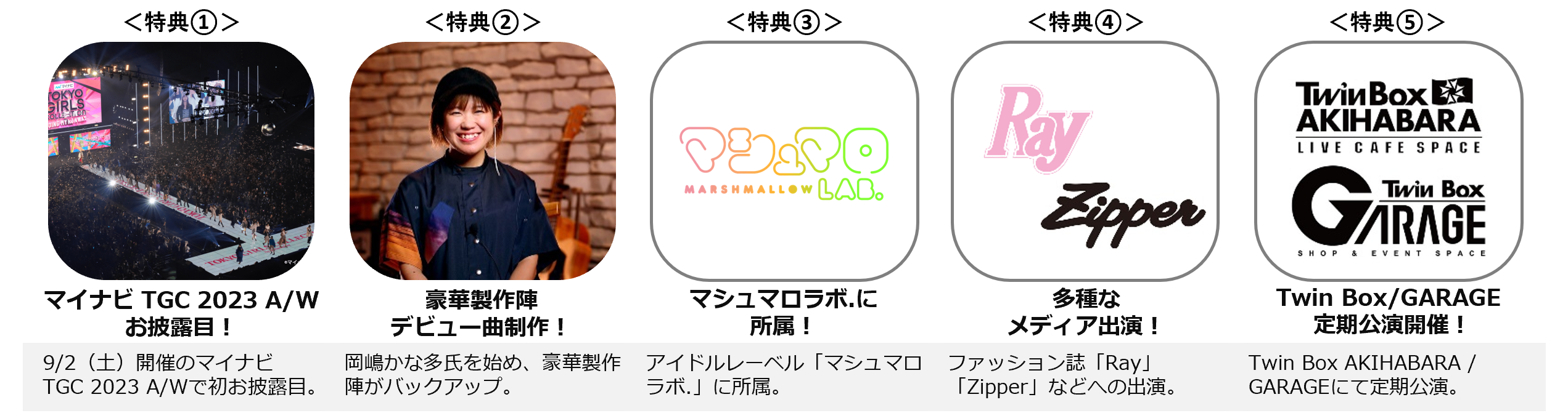 アイドル特化型レーベル「マシュマロラボ.」は、秋葉原のアイドル文化拡大を目指し、「マシュマロラボ. presents 次世代アイドルオーディション」を開催します。アイドルの新時代を切り開くこのオーディションは、アイドルの枠を超え、多様な活動領域を提供し、新たな価値観を持ったアイドルを発掘します。TGCを始めとする大型イベントへの出演など、アイドル業界に新風を吹き込むとともに、秋葉原のアイドル文化の活性化に寄与します。