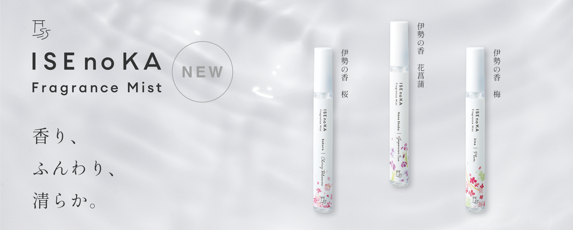 伊勢神宮を流れる五十鈴川から採水した清らかな水でつくったフレグランスミストです。つけた瞬間にやさしく香りが広がり、心身ともに浄化されていくような気分になります。伊勢に咲く美しい花から、どこか儚げで可憐なイメージした3種の香りをお届けします。保湿成分も配合、ノンアルコール、無着色、鉱物油フリー の肌に直接使用できるフレグランスミストです。メイクポーチにも入りやすいコンパクトな形状で、お伊勢参りのお土産にも最適です。