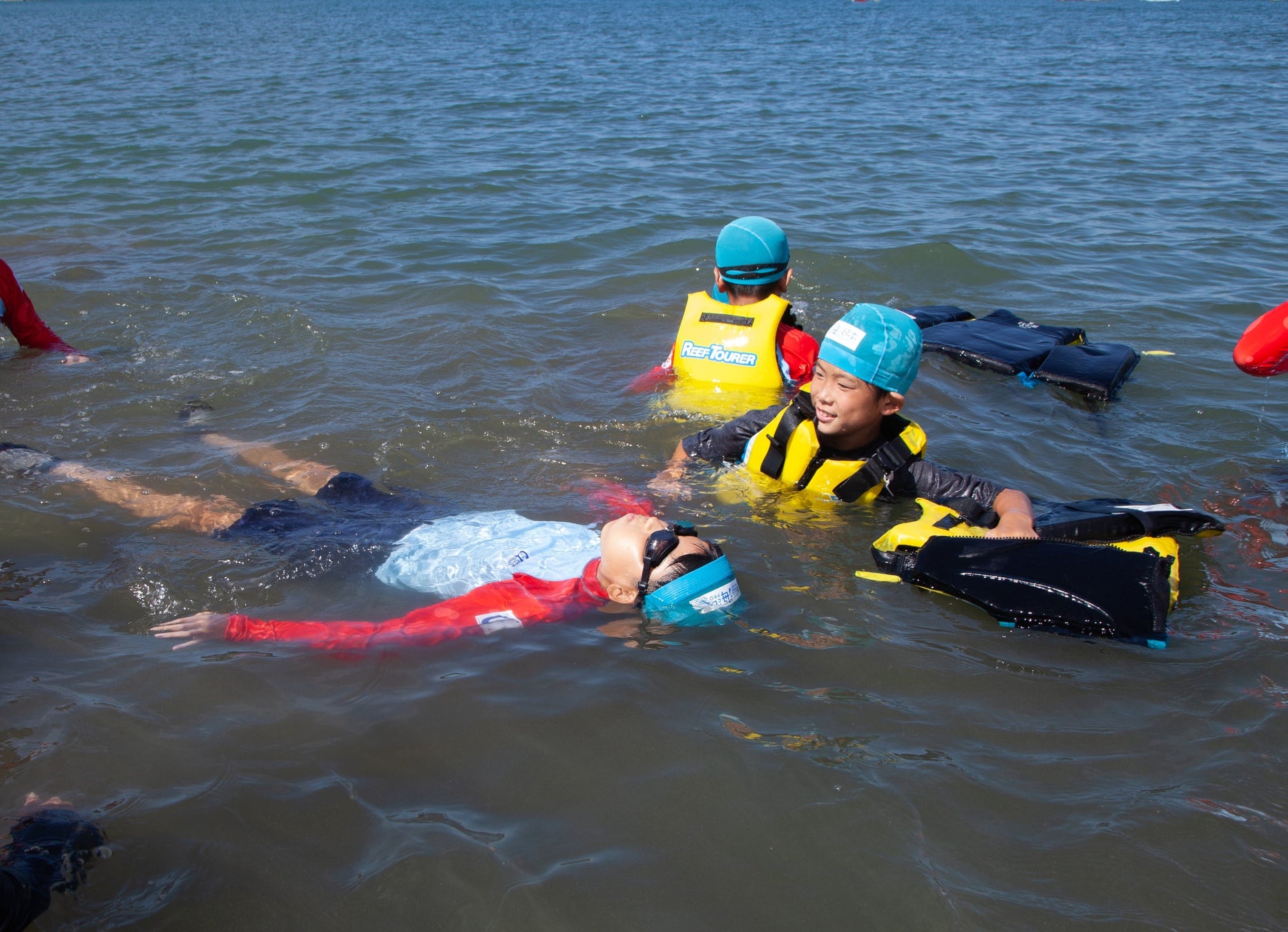正しいライフジャケットの着用方法を学んだあとは、実際に海の中に入って、体が浮く感覚を体感。海はプールと違って体が浮きやすいということや波がくると前に進むのが難しい、ということを身をもって学びました。慣れてきたらバディごとにライフジャケットを脱いで「背浮き」の練習を行います。さらに、ペットボトルなど身の回りの浮かぶものを使用した救助方法を実践し、もしもの時に自分や人を助けるための知識や技能を身につけることができました。