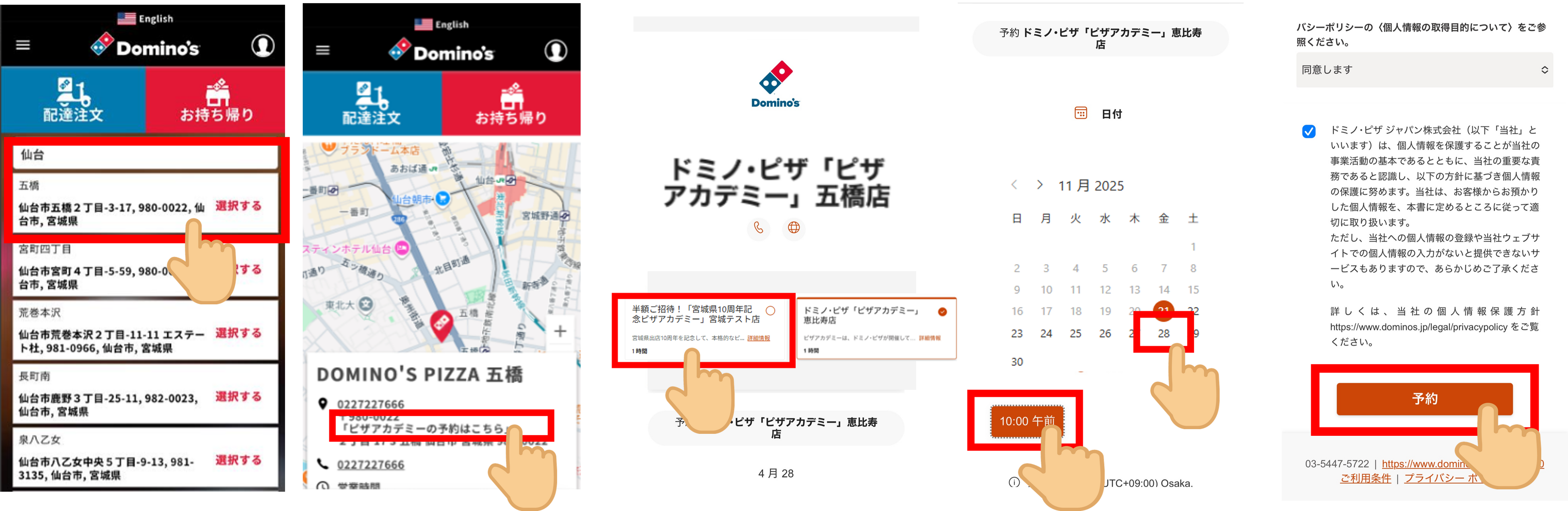 「宮城10周年記念ピザアカデミー」ご体験を希望の場合は、ご予約時に、「宮城10周年記念ピザアカデミー」を選択いただき、参加当日、担当店舗のスタッフに「宮城10周年記念ピザアカデミー」ご希望の旨をお伝えください。
