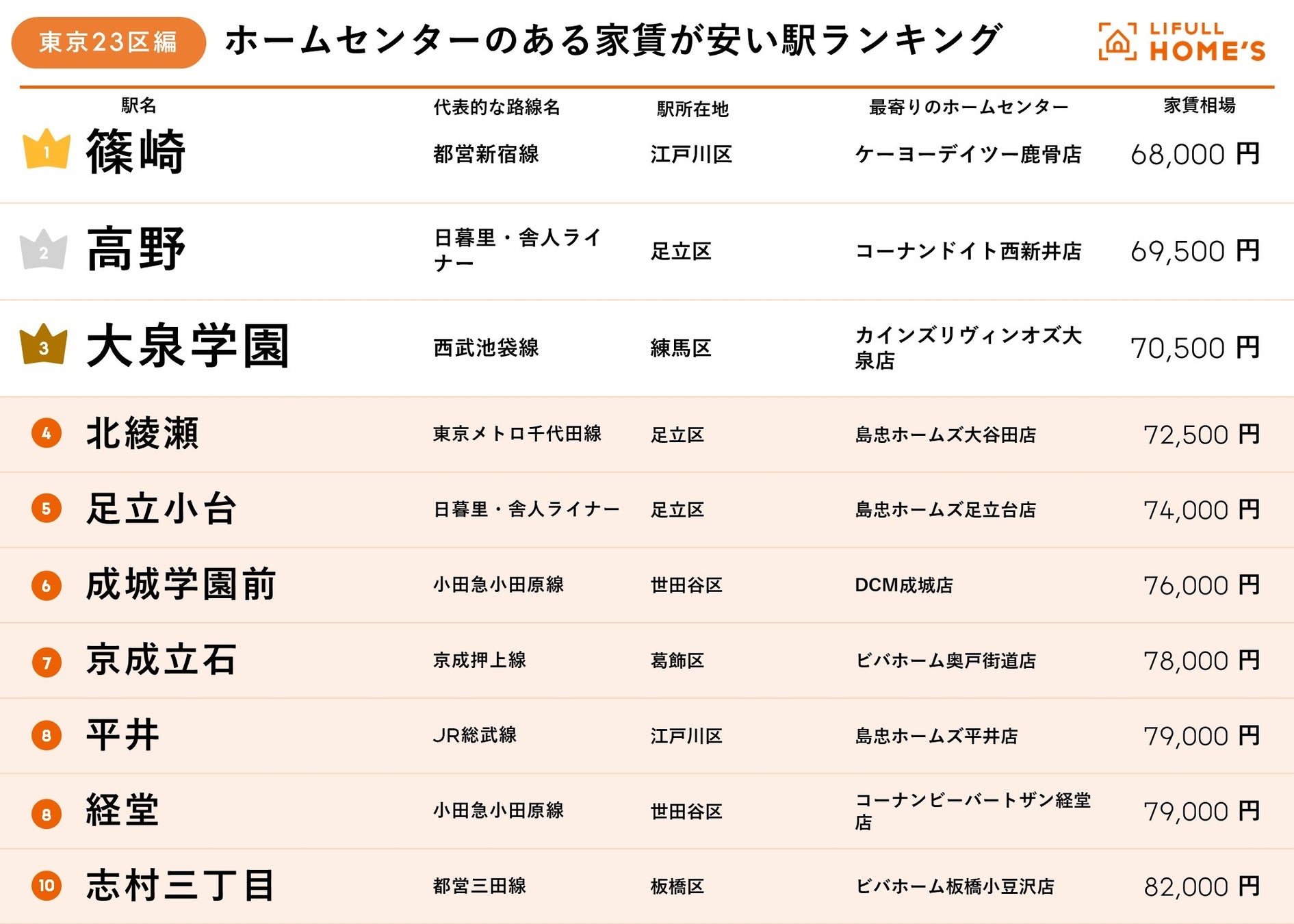 1位の「篠崎」は、「外食チェーン店がある家賃の安い駅ランキング(東京23区)」で複数のジャンルで上位にランクインした駅です。都営新宿線の駅で「新宿」にも38分ほどでダイレクトアクセスできます。LIFULL HOME'S「まちむすび」によるとファミリーが多く、静かに暮らしたい人に向いている街とされています。ホームセンターは「篠崎」から徒歩約12分の距離にあります。(※2)2位の「高野」は日暮里・舎人ライナーの沿線にあり、「日暮里」から6駅目に位置します。LIFULL HOME'S「まちむすび」によると駅前すぐのホームセンター以外にも、業務用スーパーがあり、神社や運動に適した公園があるなどファミリーに向いている街とされています。日常生活に便利な施設が揃っているだけでなく、緑豊かな地域も多く、都心に近いながらも静かで穏やかな生活を送ることができます。3位の「大泉学園」は西武池袋線にあり、特急や快速急行などが停車するため、都心へのアクセスが便利でありながら、周囲には緑豊かな公園や住宅地が広がっています。ホームセンターは駅の北側で徒歩13分の距離にあります。LIFULL HOME'S「まちむすび」によると地域コミュニティも活発で、地元のイベントや祭りなどに参加することで、地域住民との交流も深めることができるため、単身でもファミリーでもバランスの取れた生活を送ることができそうです。