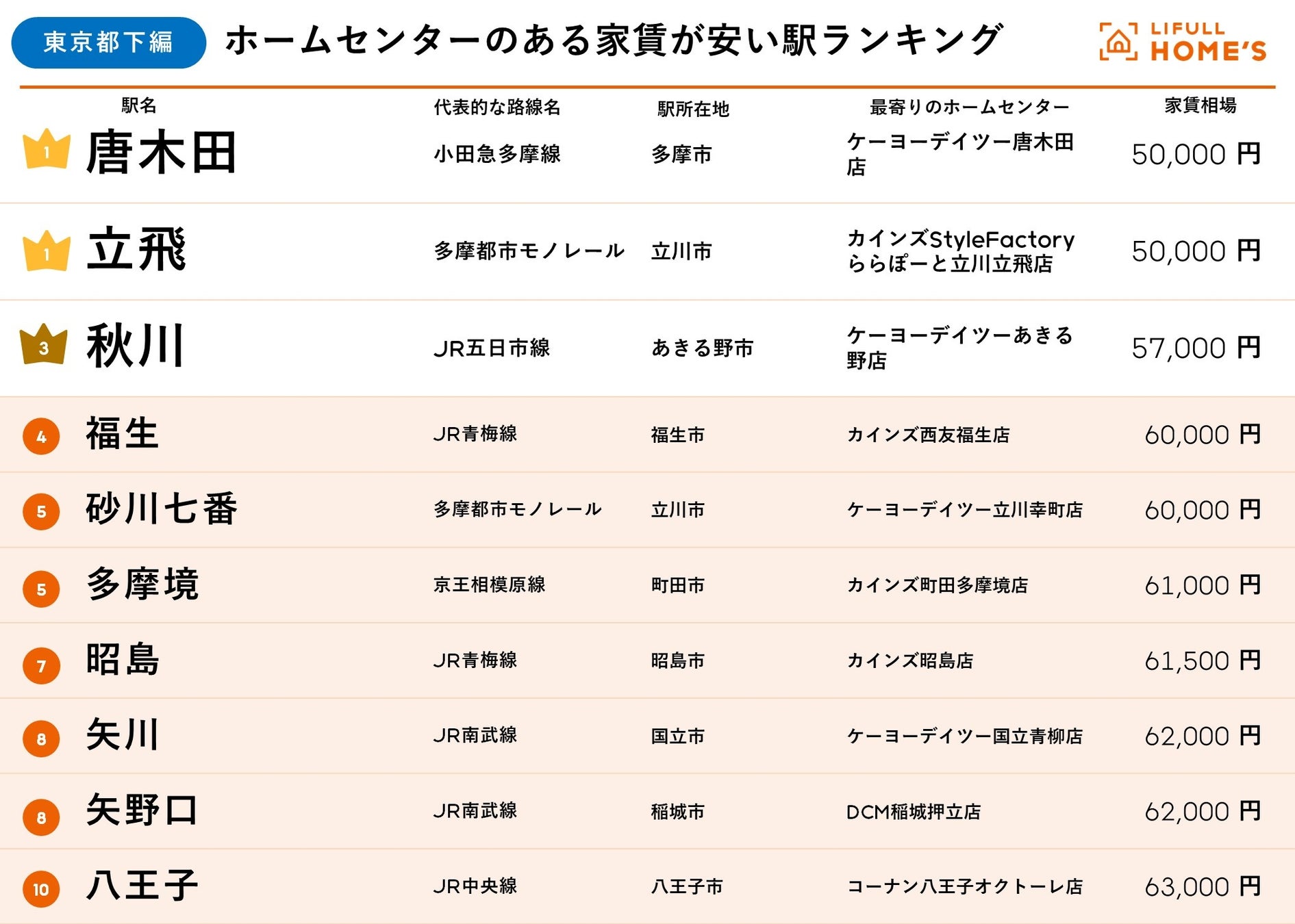 多摩市の「唐木田」、立川市の「立飛」(家賃相場50,000円)が同率1位となり、3位はあきる野市の「武蔵増戸」(同55,000円)と5万円台の駅が上位を占めました。