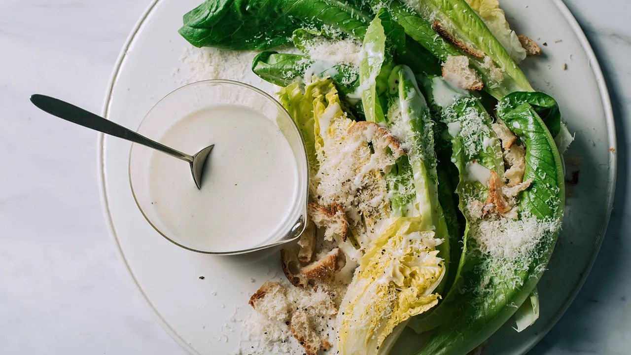 Tips シンプルにミニロメインレタスにかけ、仕上げにクルトン、ブラックペッパー、パルメザンチーズをひと振り。