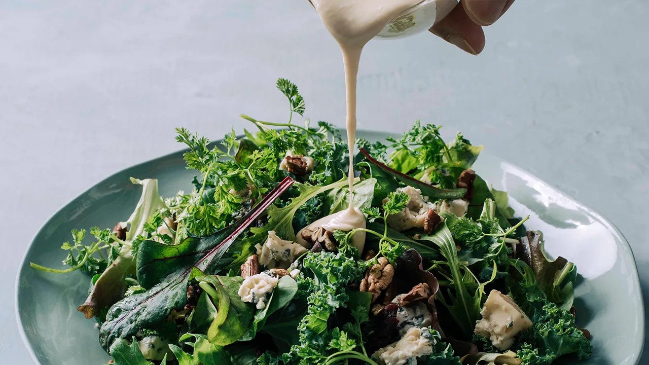 ベビーリーフ、ケール、セルフィーユ、ピーカンナッツ、ブルーチーズにひと回しかけて、ごちそうサラダのできあがり。