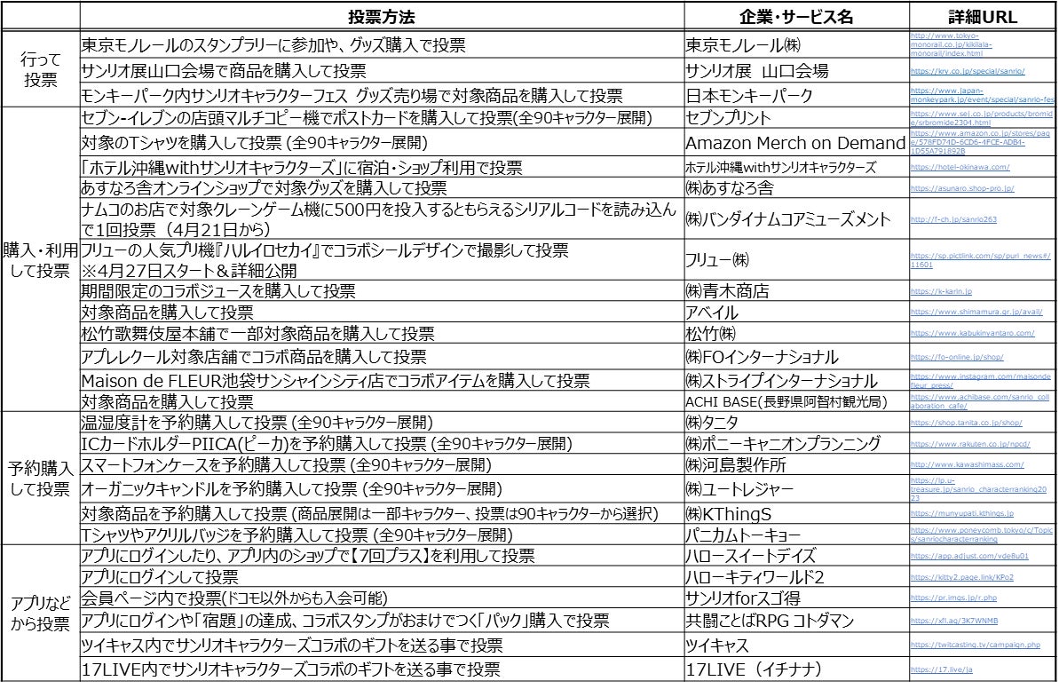 サンリオとコラボレーションしている企業のサービスを利用し、投票することもできます。投票期間や投票方法などの詳細は、各詳細URLからご確認ください。