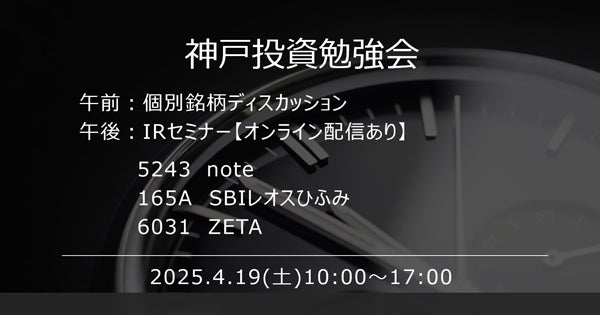 2025年4月19日(土)に神戸で開催される個人投資家向けIRセミナー「神戸投資勉強会」に代表取締役社長の山崎が登壇し、ZETAのIR情報を読み解く上でのポイントについて詳しく解説いたします。