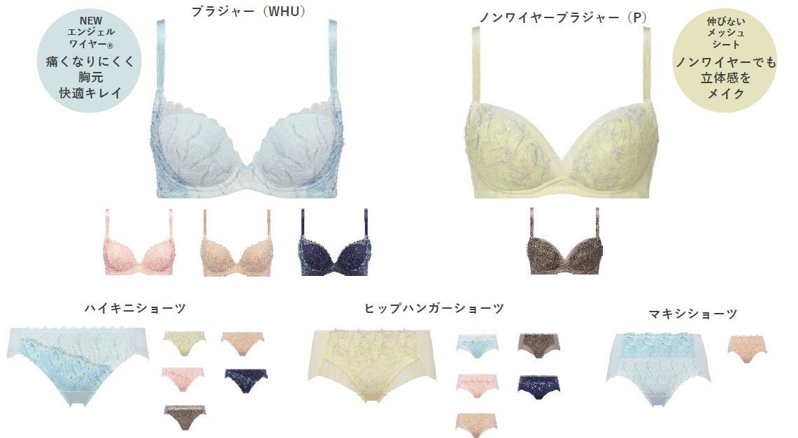 ワイヤーブラ(WHU)は、リズミカルなラインを大胆に使った編みレースやラメ糸のきらめきがなんとも華やか!ノンワイヤー(P)は、やさしい着けごこちに似合う落ち着いた配色の刺しゅうと可憐な小花柄のプリントチュールの組み合わせ。それぞれ違うデザイン&カラーで、異なる世界観をお楽しみいただけます。