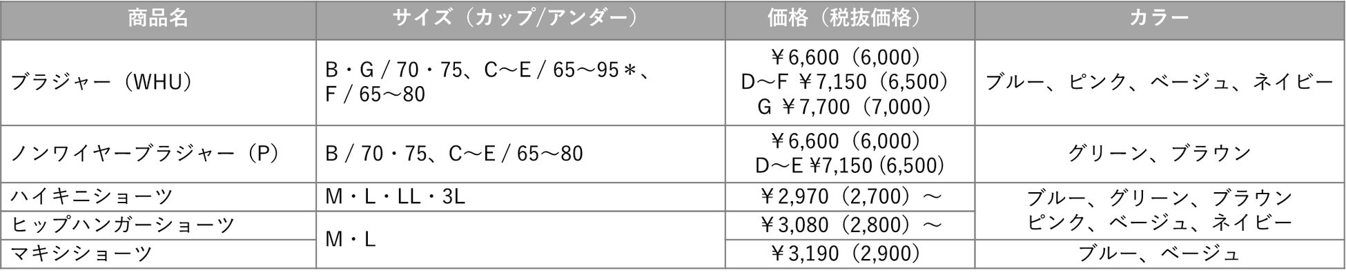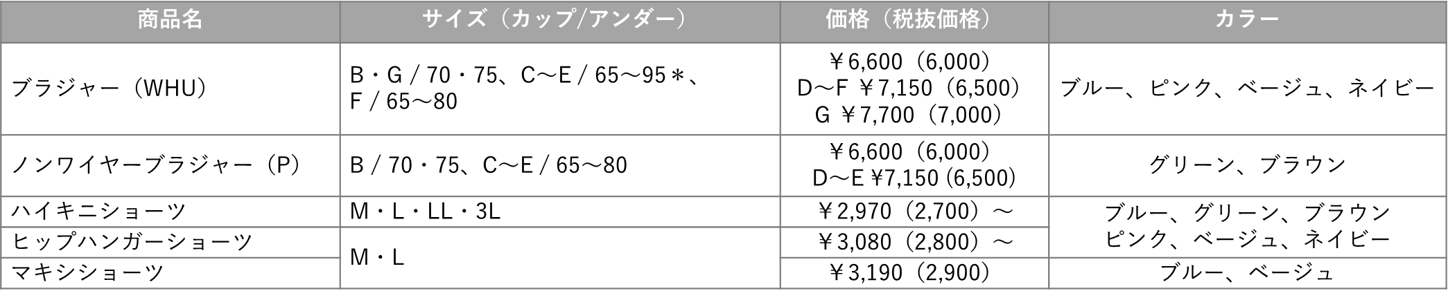 *ブラジャー(WHU)C〜E / 85〜95、ハイキニショーツ LL・3Lは限定店舗での展開。