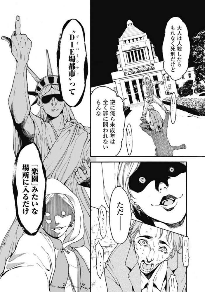 時は20XX年。日本は法律が変わり、殺人を犯した成人は、確実に死刑に――。その一方、殺人を犯した18歳未満の未成年は、「DIE場都市」というユートピアへ入るという…。
