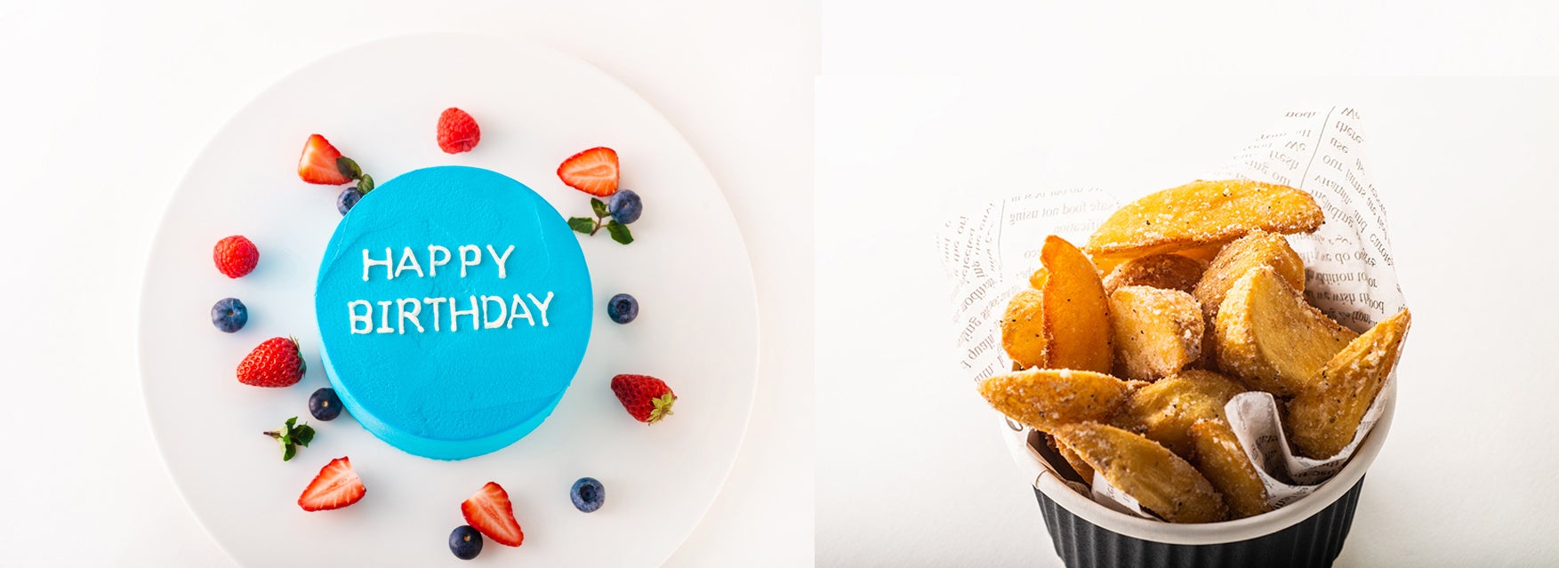 アニバーサリールームプラン限定のオプションメニューとして「アニバーサリーカラーケーキ」を販売します。ホテルメイドのショートケーキを、色鮮やかな生クリームでデコレーションしました。全9色の中から、お好きな色や推しカラーをお選びください。デコレーションのフルーツは別添えでご用意し、お客さまご自身で推しへの愛を込めたオリジナルのケーキに仕上げていただきます。ケーキは甘い×しょっぱいの“無限ループ”が止まらない、香り豊かなトリュフポテトとの“罪な”セットでご提供します。