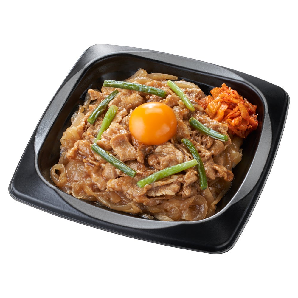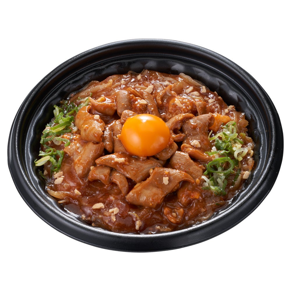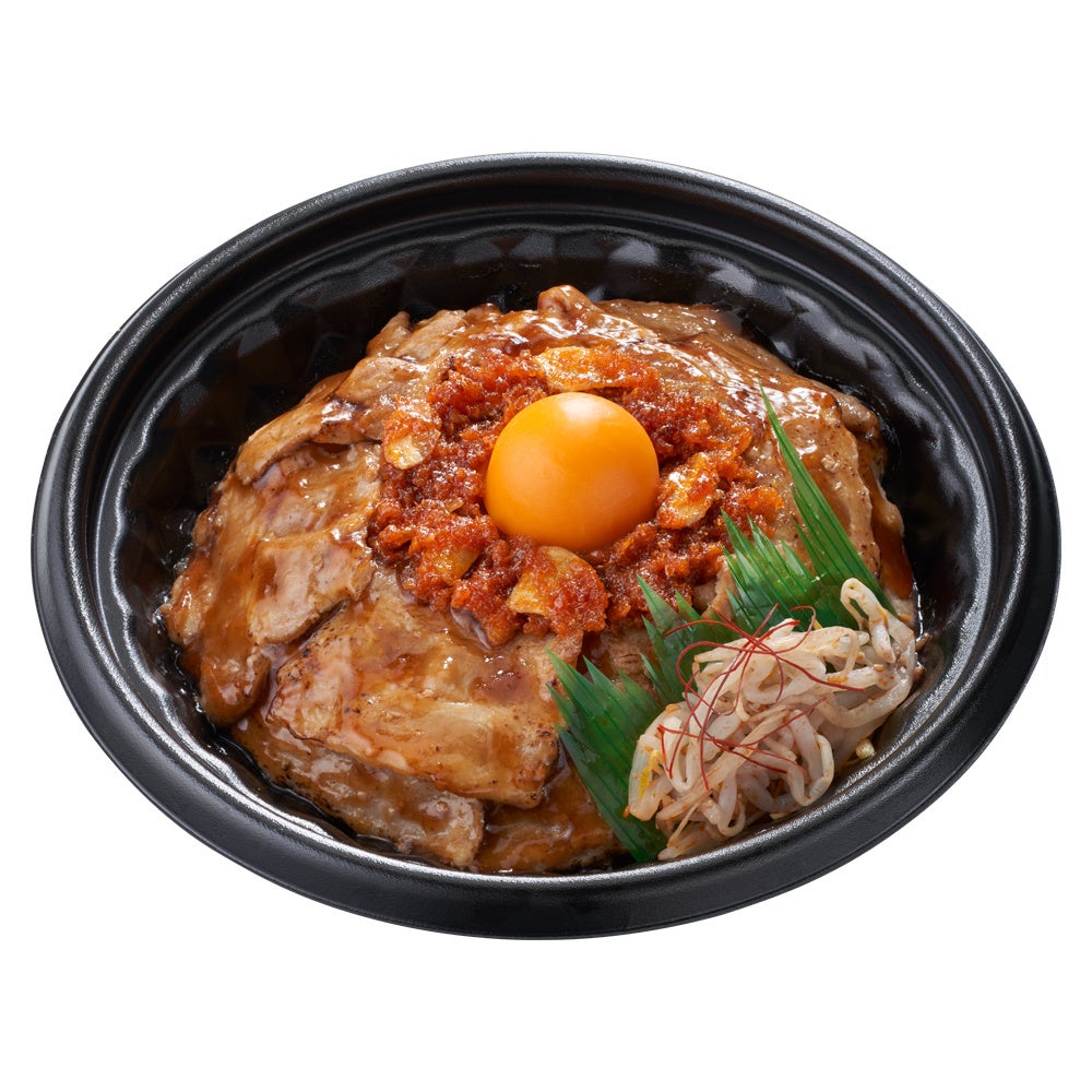 商品特長:たまごかけ風ごはんに、焼肉のたれを絡めた豚焼肉とピリ辛な具入りラー油炒めをのせた丼です。