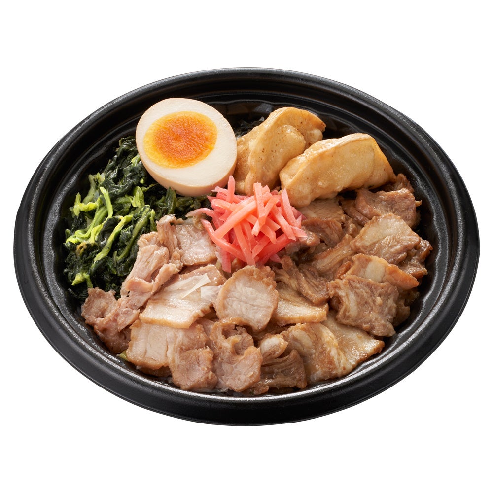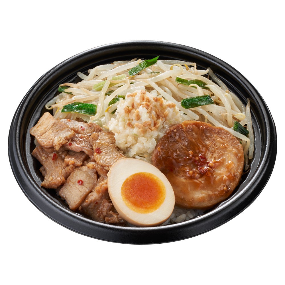 商品特長:厚切りチャーシューと刻みチャーシューの2種類がポイント。豚骨ベースのピリ辛醤油にんにくダレをごはんの上にのせた丼です。
