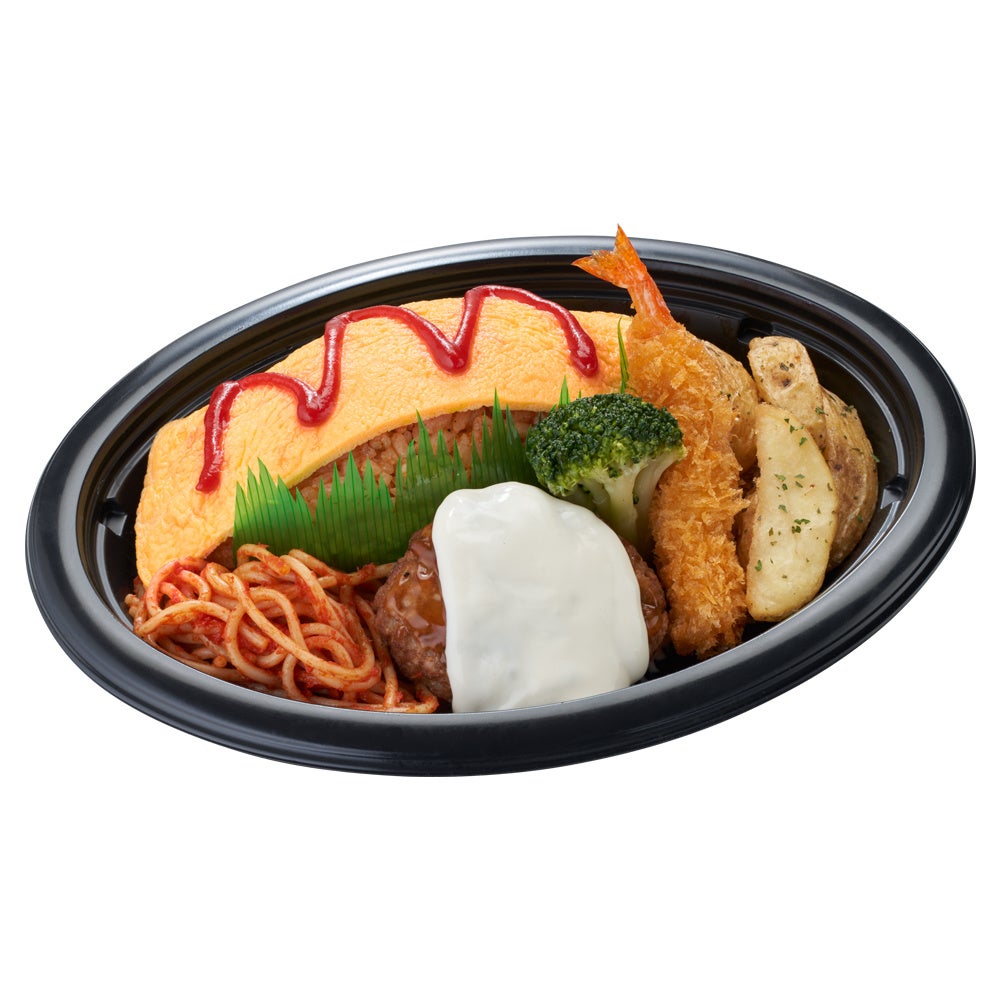商品特長:オムライス・エビフライ・ナポリタン・ハンバーグ・フライドポテトなど、洋食おかずの盛り合わせです。