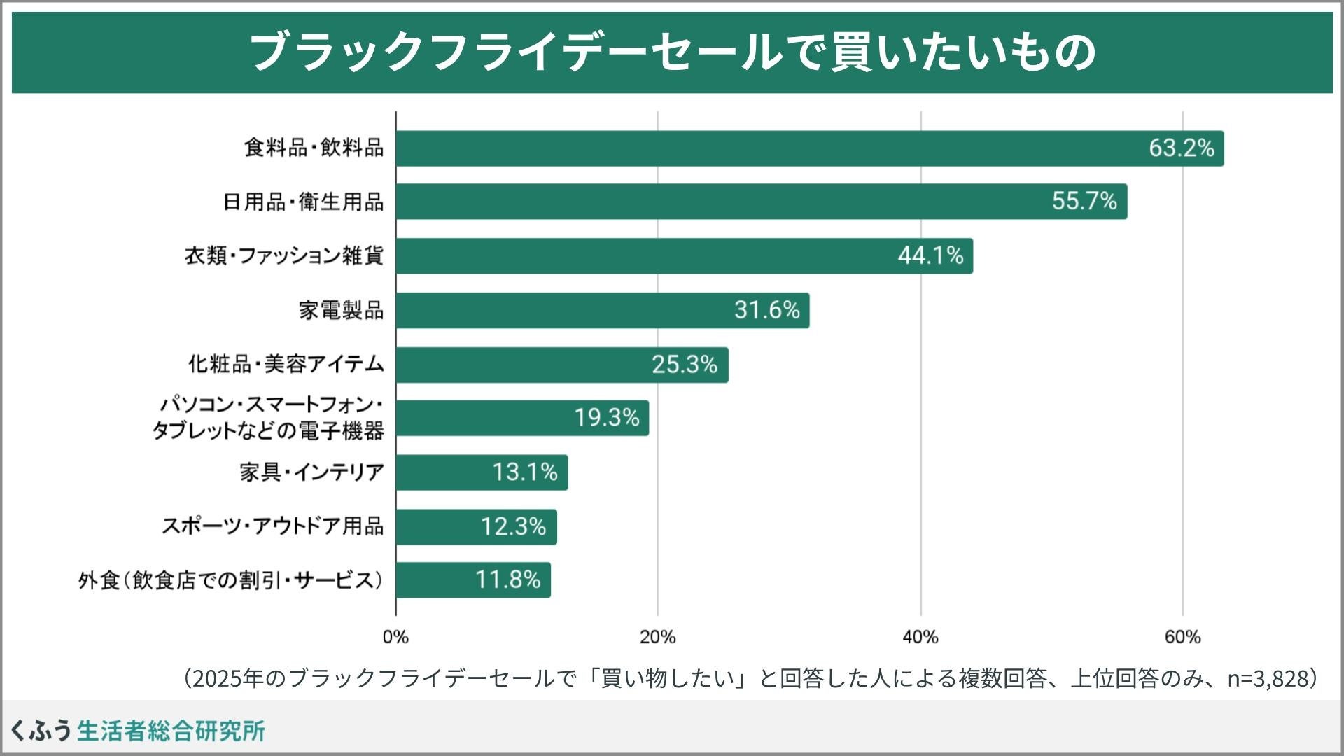 買いたいものは「食料品・飲料品」(63.2%)が最も多く、「日用品・衛生用品」(55.7%)が続きました。ブラックフライデーセールにおいては、家電や家具、パソコンなどの高額商品よりも日常的に必要なものを購入したい生活者が多いことがわかります。