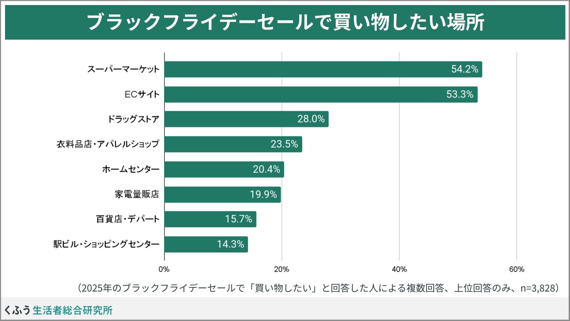 買い物したい場所は「スーパーマーケット」(54.2%)が最も多く、「ECサイト」(53.3%)が僅差で続きました。「ドラッグストア」(28.0%)、「衣料品店・アパレルショップ」(23.5%)、「ホームセンター」(20.4%)も2割以上の人が選択しており、生活者がさまざまな業態のブラックフライデーセールを期待していることがわかります。