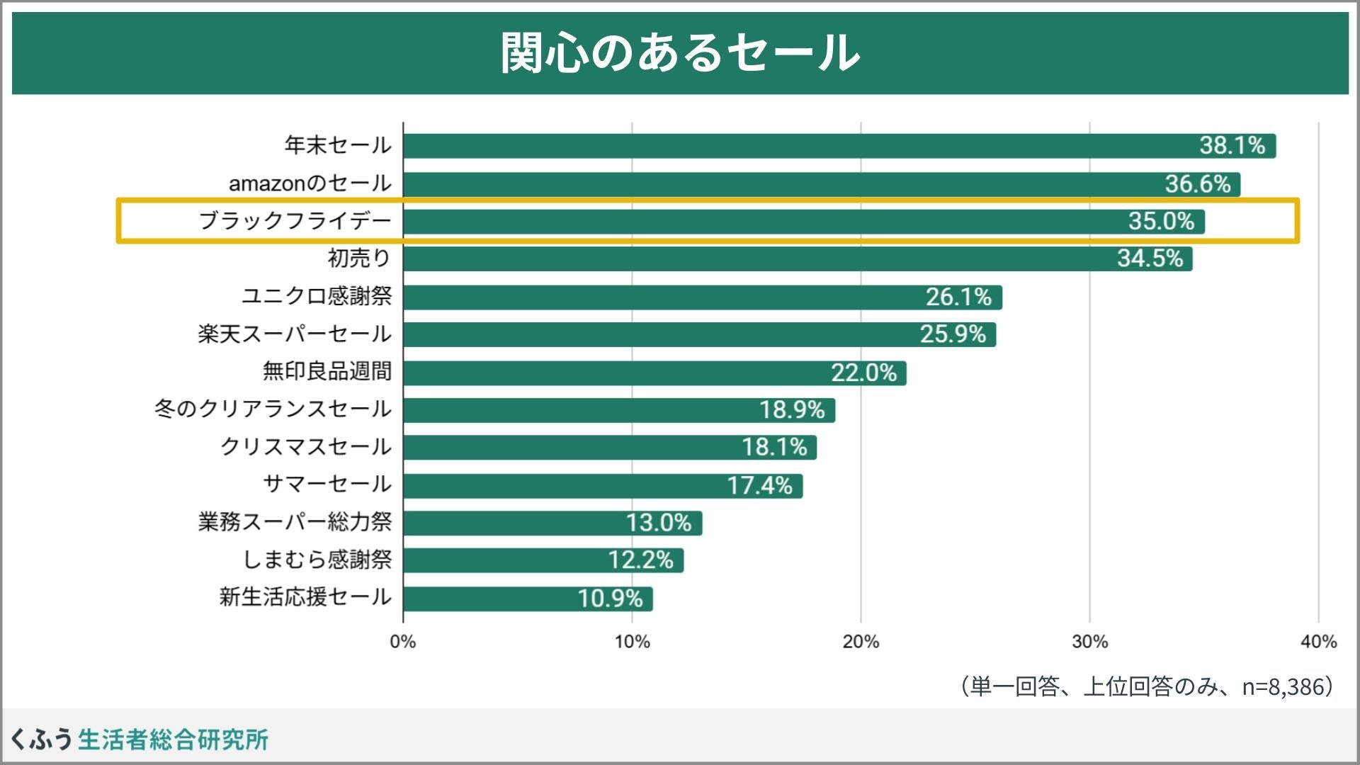 季節のセール・企業の恒例となっているセールの中で、買い物したり開催時期をチェックしたりする"関心のあるセール"をたずねたところ、「年末セール」(38.1%)が最も多く、僅差で「amazonのセール」(36.6%)、「ブラックフライデー」(35.0%)は3番目に関心が高いことがわかります。