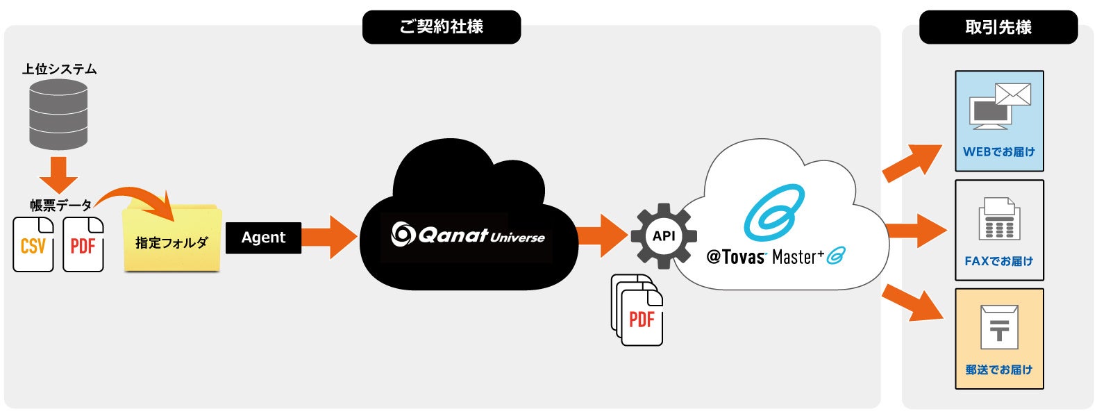 今回、「@Tovas Master+」と「Qanat Universe」が連携することで、基幹システム等から出力されるデータ(CSV/PDF)を指定のフォルダに保存するだけで、「@Tovas Master+」で利用可能なデータ形式に変換し、自動でアップロードすることができます。これにより、基幹システムから「@Tovas Master+」用のデータや帳票を作成したり、アップロードしたりする手作業が不要になり、業務効率の向上に加え、作業の人為的ミスやデータ漏洩などのリスク削減にもつながります。帳票の配信手段は、これまで同様、電子ファイル、FAX、郵送と取引先毎に選択できるため、取引先に負担をかけず、電子化を促進することが可能です。■提供開始日