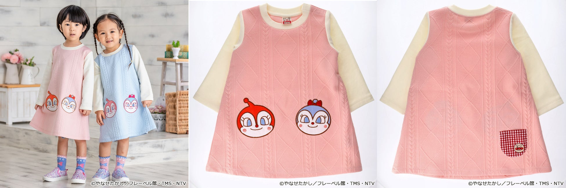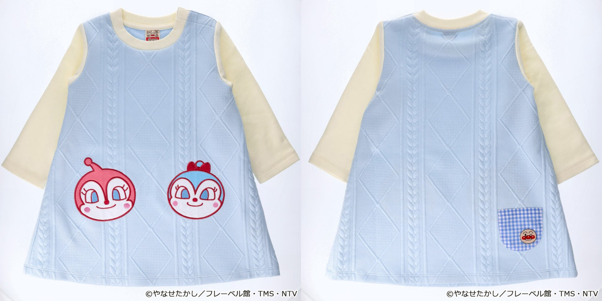 ドキンちゃんとコキンちゃんのアップリケが可愛らしいワンピースです。ぷっくりしたジャガードキルト素材があったかく、春先まで長く着られます。後ろのアンパンマンワッペンのついたポケットもポイントです♪