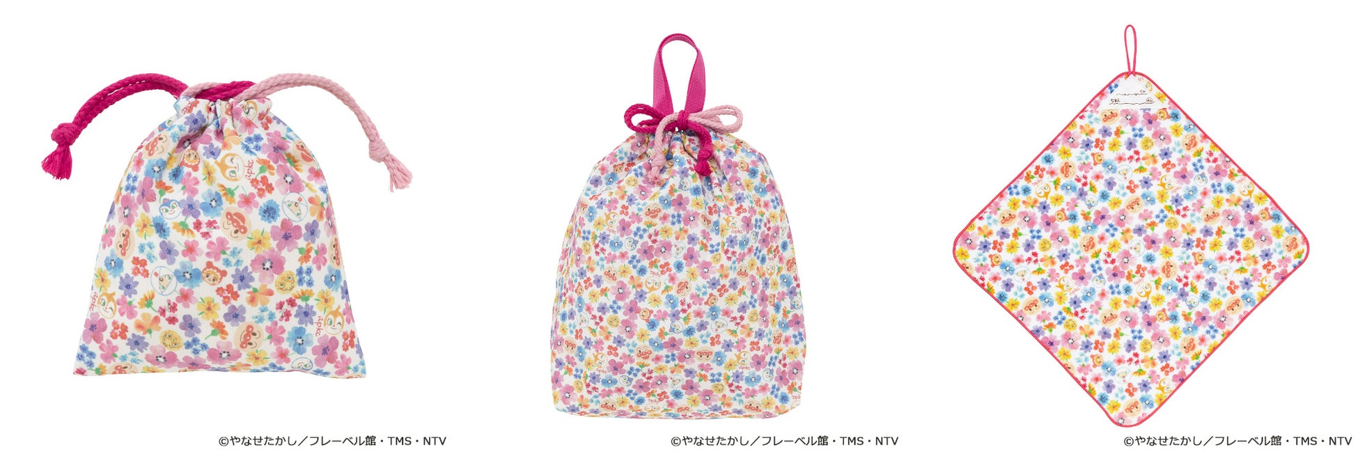 水彩タッチのお花柄の中にアンパンマン・ドキンちゃん・コキンちゃん・メロンパンナちゃん・ロールパンナ・あかちゃんまんを可愛らしくデザインしました。