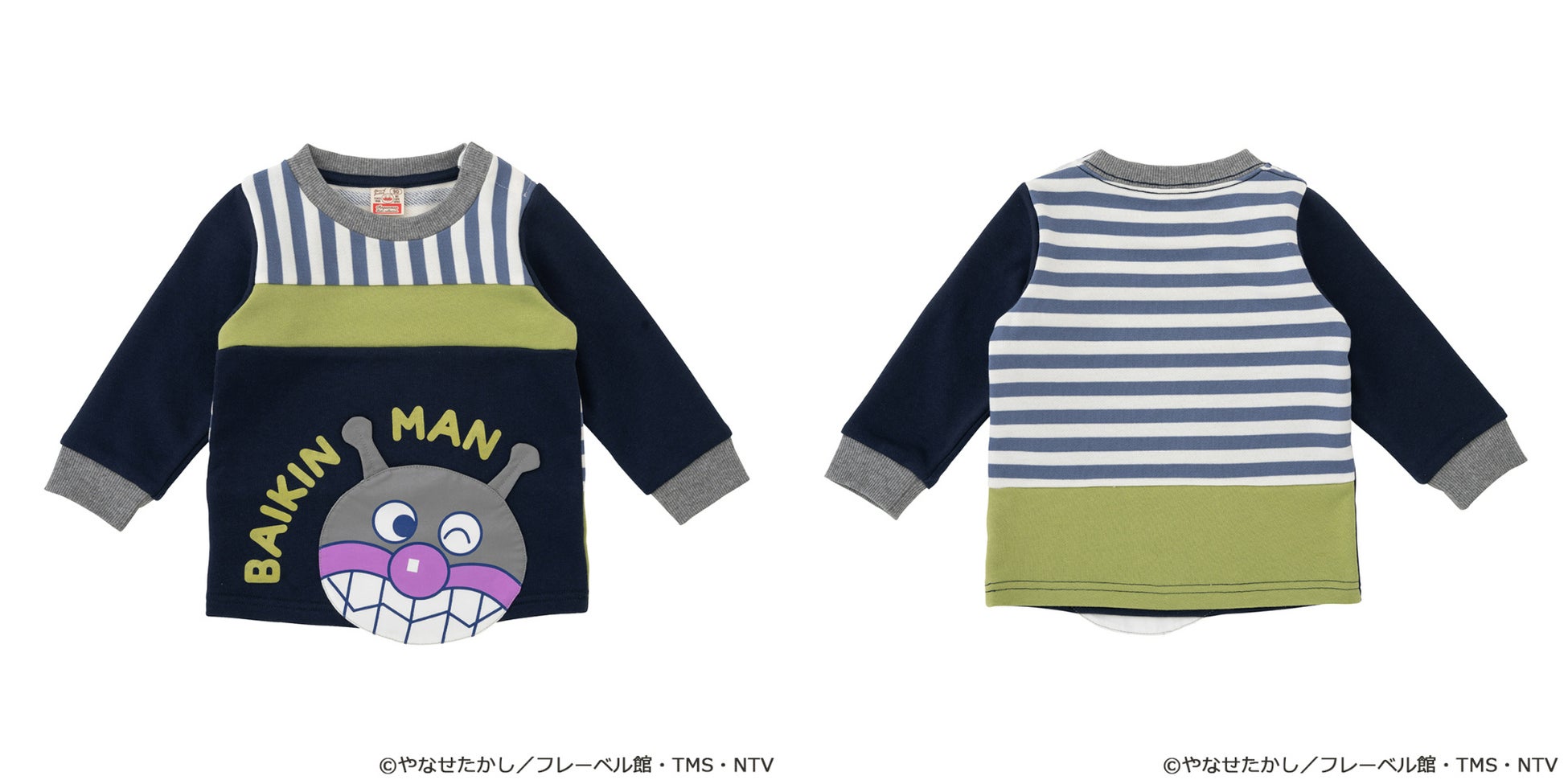 アンパンマンとばいきんまんの大きなお顔アップリケが可愛らしいトレーナーです。前後のストライプや配色の切替にこだわった1枚です♪