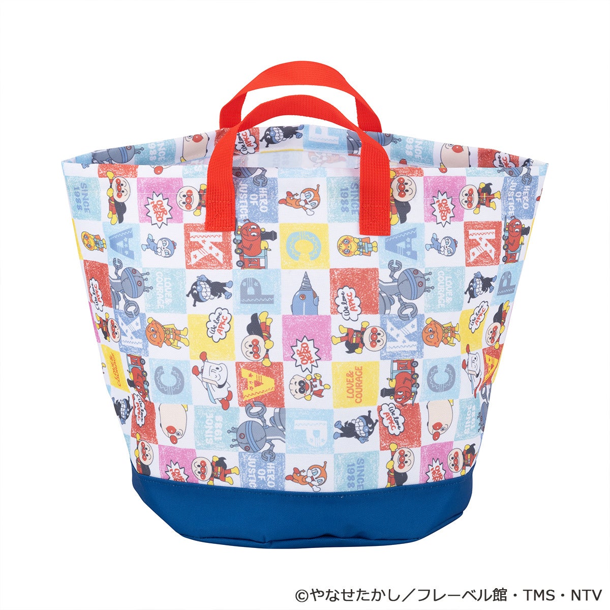 カラフルなスクエアの中にアンパンマンやばいきんまん・だだんだん・どんぶりまんトリオなどたくさんのなかまたちをデザインしました。