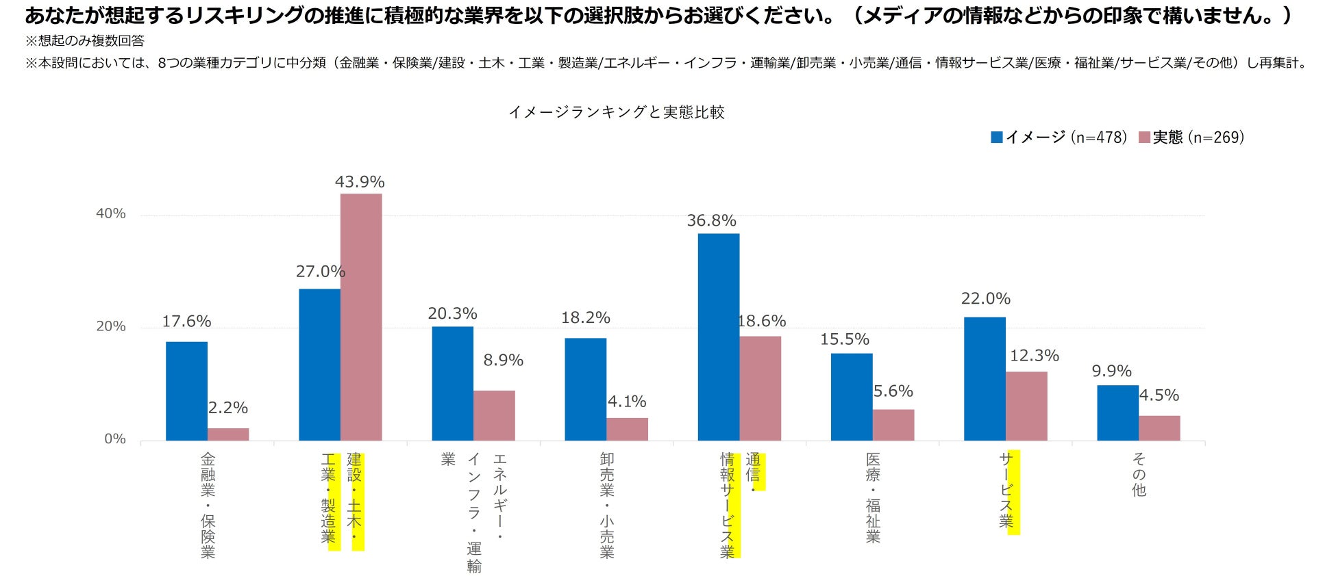 リスキリングの推進に積極的な業界のイメージを尋ねたところ、1位は「通信・情報サービス業」(36.8%)、次いで2位は「建設・土木・工業・製造業」(27.0%)、3位は「サービス業」(22.0%)という結果になりました。