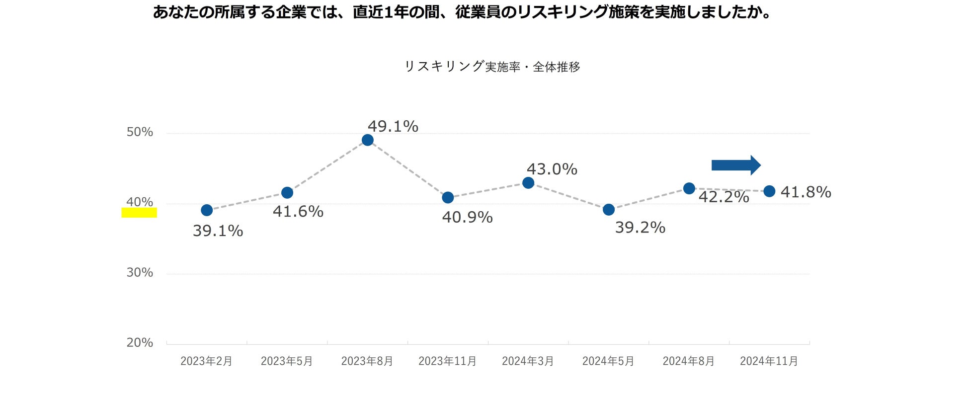 所属企業において、「直近1年の間で、従業員のリスキリング施策に関する取り組みを行いましたか︖」と尋ねたところ、「実施した」との回答は、前回の42.2%に比べ0.4PT減少し、今回は41.8%となりましたが約40%の傾向を維持しています。