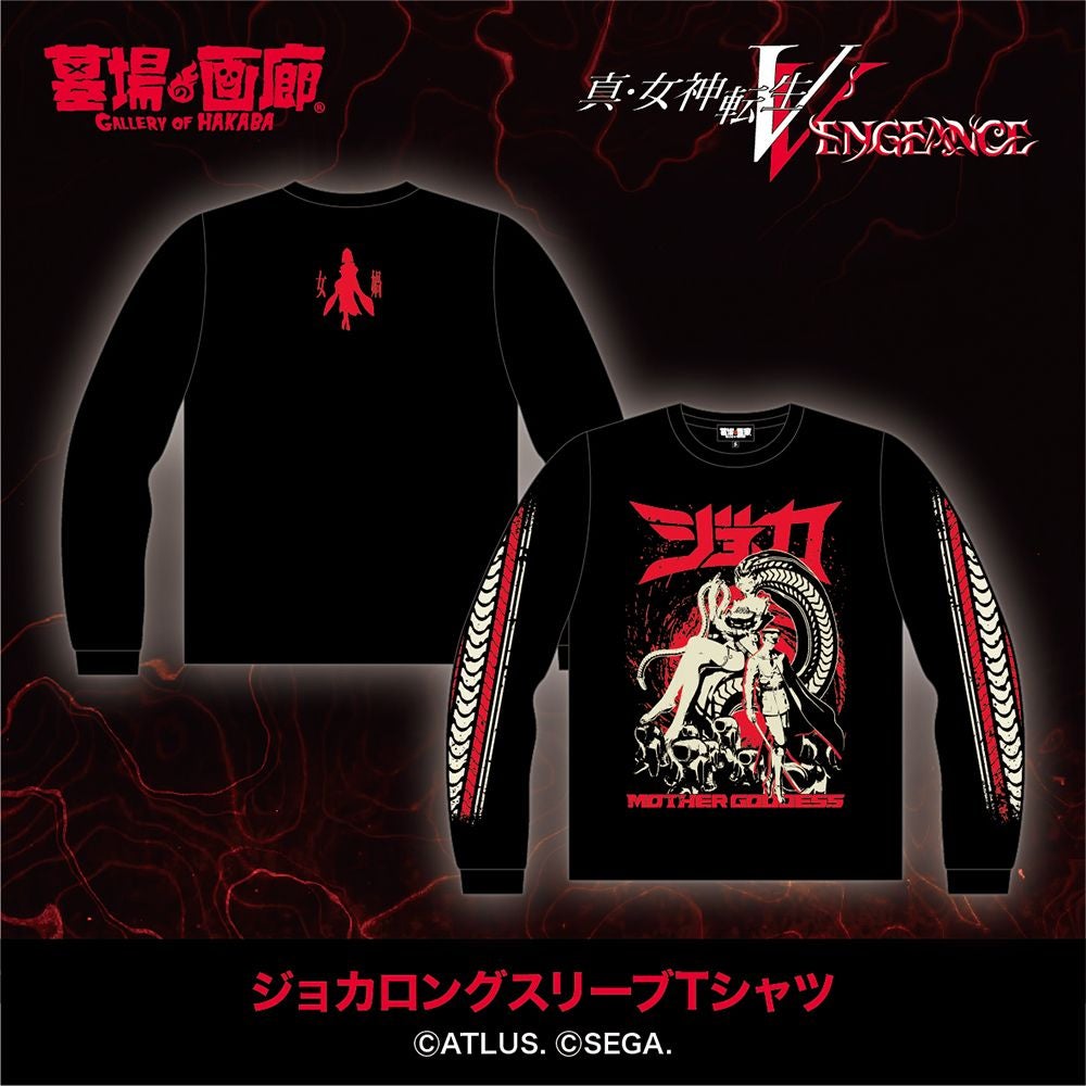 『真・女神転生V Vengeance』に登場する地母神・ジョカを、ロングスリーブTシャツとして召喚!フロントにはジョカの最終形態と土偶たち、そして八雲ショウヘイの姿がプリントされ、両袖には蛇柄が入ったインパクト抜群のデザイン!