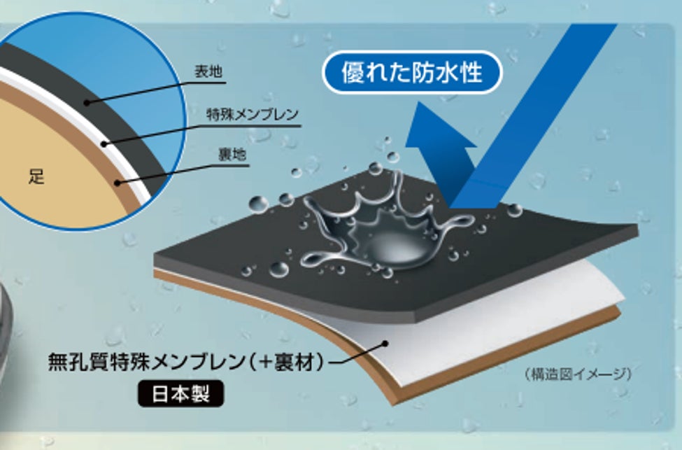 ①防水設計アッパーには防水素材の日本製メンブレンの『WATER-TECH』を採用し、縫製部にはシームシーリング加工を施すことで、雨の侵入を徹底ガード。梅雨の雨でも安心感を足元から提供します。