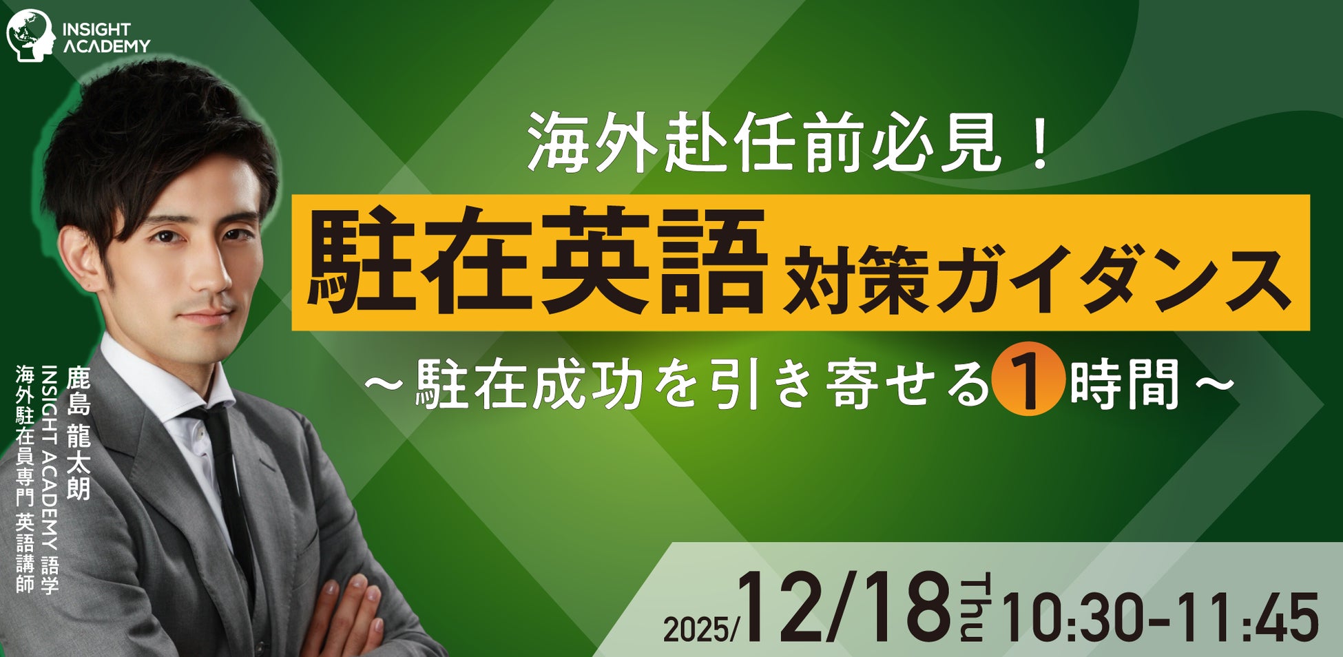 グローバル⼈材育成・研修業を⼿掛けるインサイトアカデミー株式会社(本社:東京都港区新橋、代表:金 珍燮)は、無料webセミナー「【海外赴任前必見!】”駐在英語” 対策ガイダンス~駐在成功を引き寄せる1時間~」を開催致します。