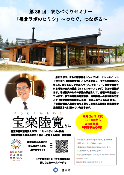 豊中市は、地域のまちづくりへの関心を高めてもらうことを目的に、平成23年(2011年)から同セミナーを開始し、まちづくりの第一線で活躍する実践者を迎えた講演会などを開催しています。