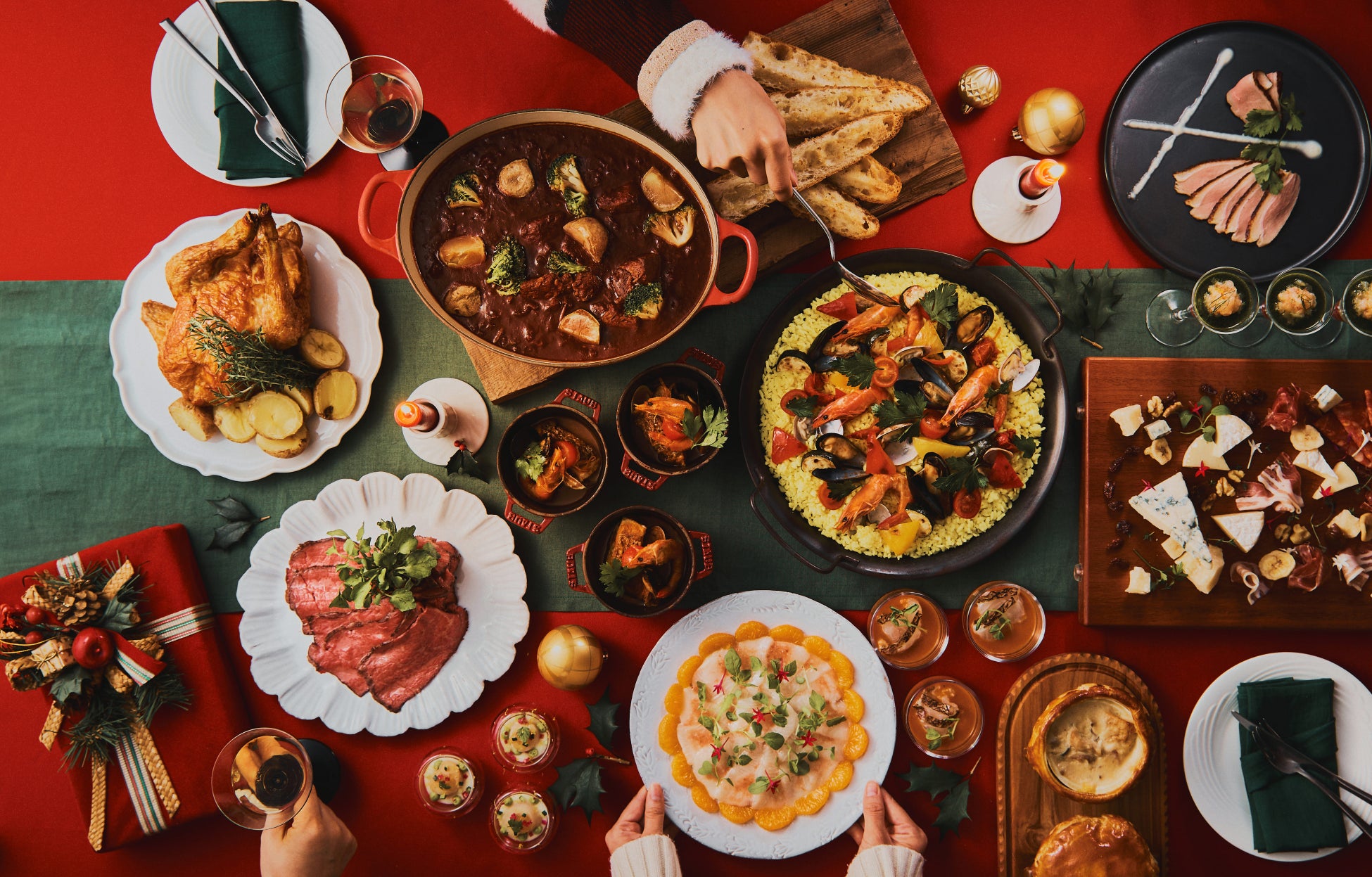 煌びやかな「クリスマスホームパーティー」をテーマとしたビュッフェをご提供。冬の味覚を使用した彩り豊かなメニューをラインアップいたします。「蕪のムースと甘エビのタルタル ノエル風」や「真鯛の炙り トマトのフレッシュなソース」をはじめとした冷製料理から、定番の「ローストチキン」や、「ホタテとほうれん草のキーマカレーグラタン」、「国産牛のローストビーフ(ディナー限定)」といった温かい料理はもちろんのこと、サラダやスイーツ、アイスクリーム各種も取り揃え、大切な方と過ごす温もりあふれるひとときを演出します。